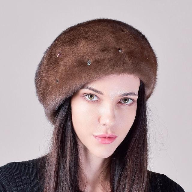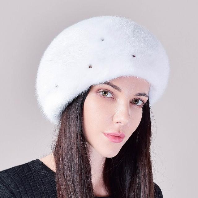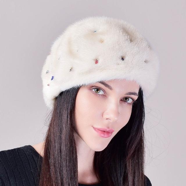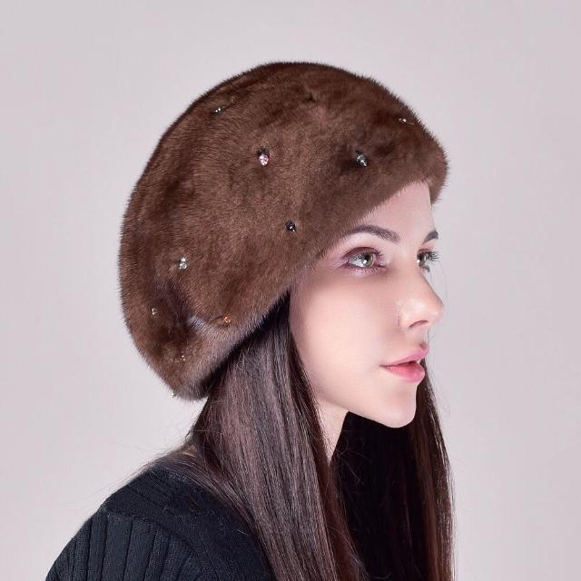 Seven七- 冬季女士新款保暖整貂皮水貂毛帽子軟體護耳貝雷帽釘珠子水鉆優雅