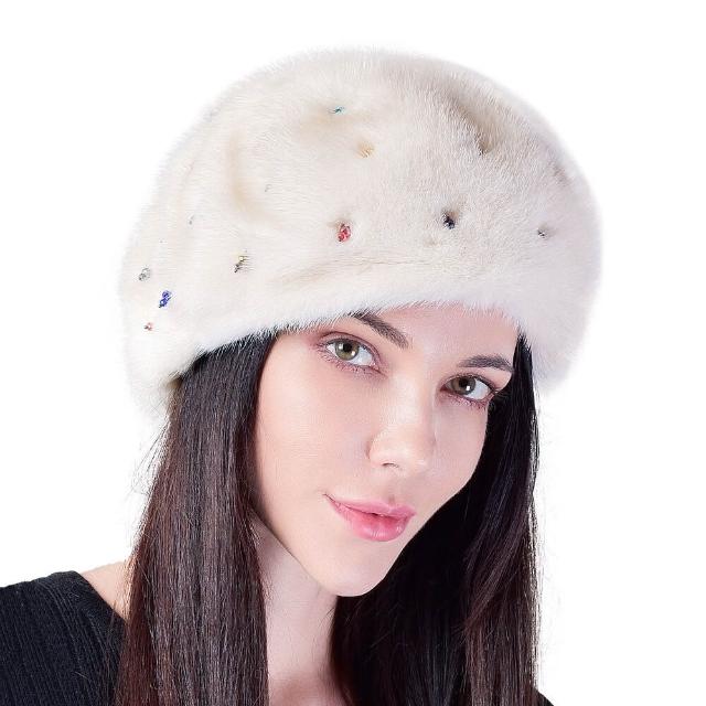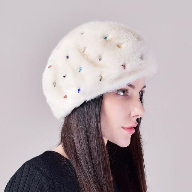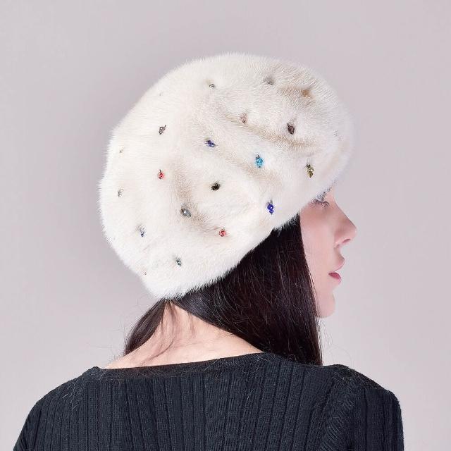 Seven七- 冬季女士新款保暖整貂皮水貂毛帽子軟體護耳貝雷帽釘珠子水鉆優雅