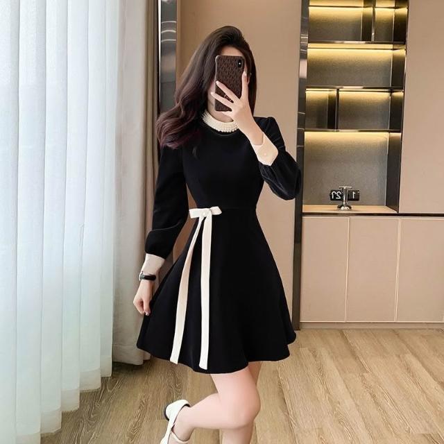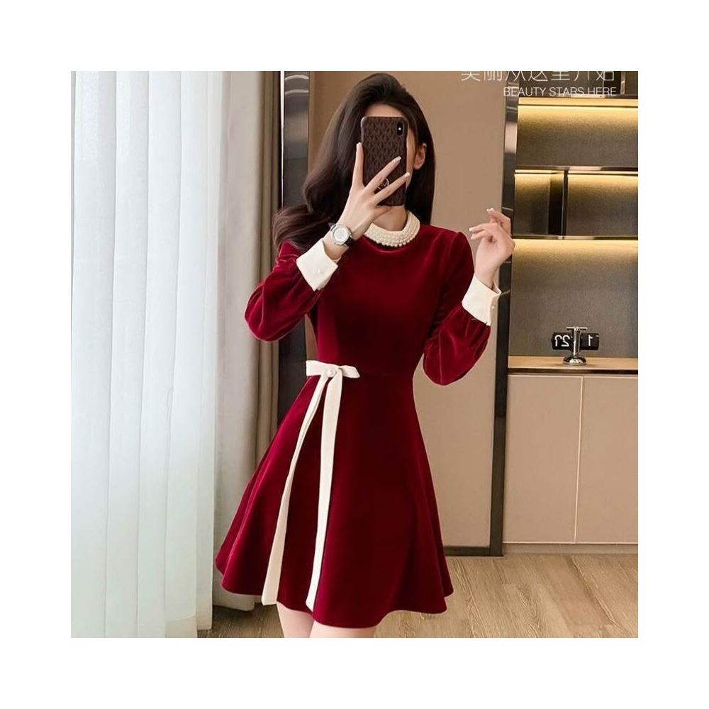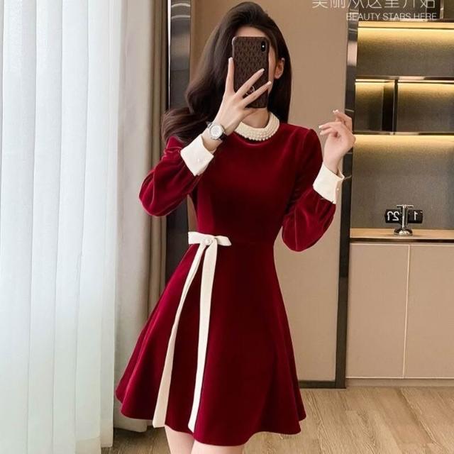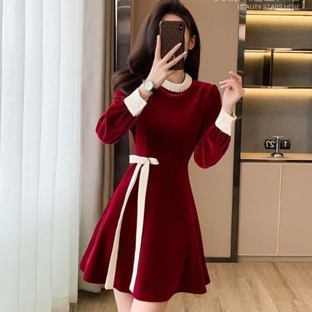 Seven七- 金絲絨紅色連衣裙短款秋冬新款釘珠法式小香風禮服短裙打底小紅裙