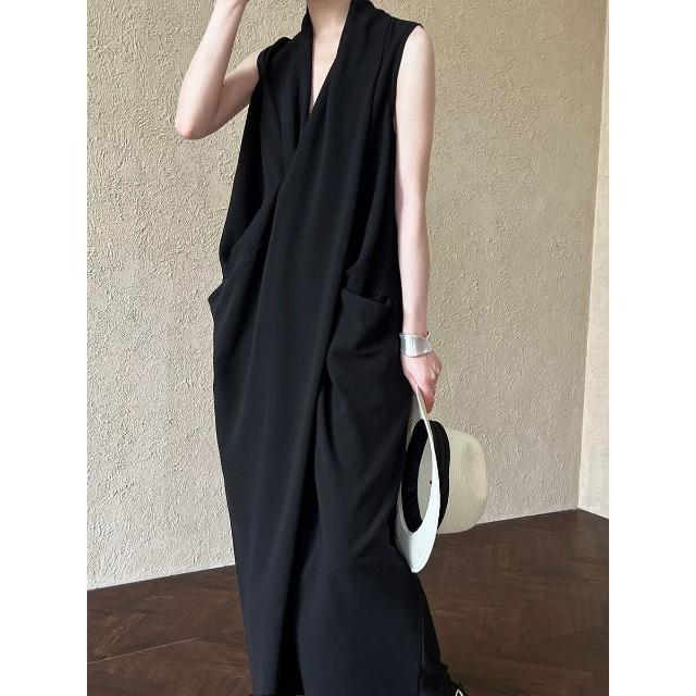 Seven七- 氣質 V領 無袖 扭結 收腰 連衣裙 女 顯瘦 不規則 高級 港風 長裙子