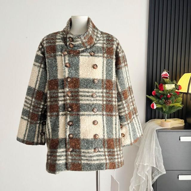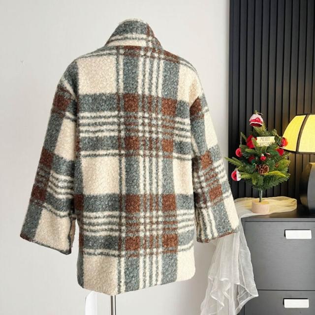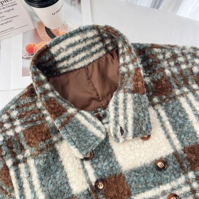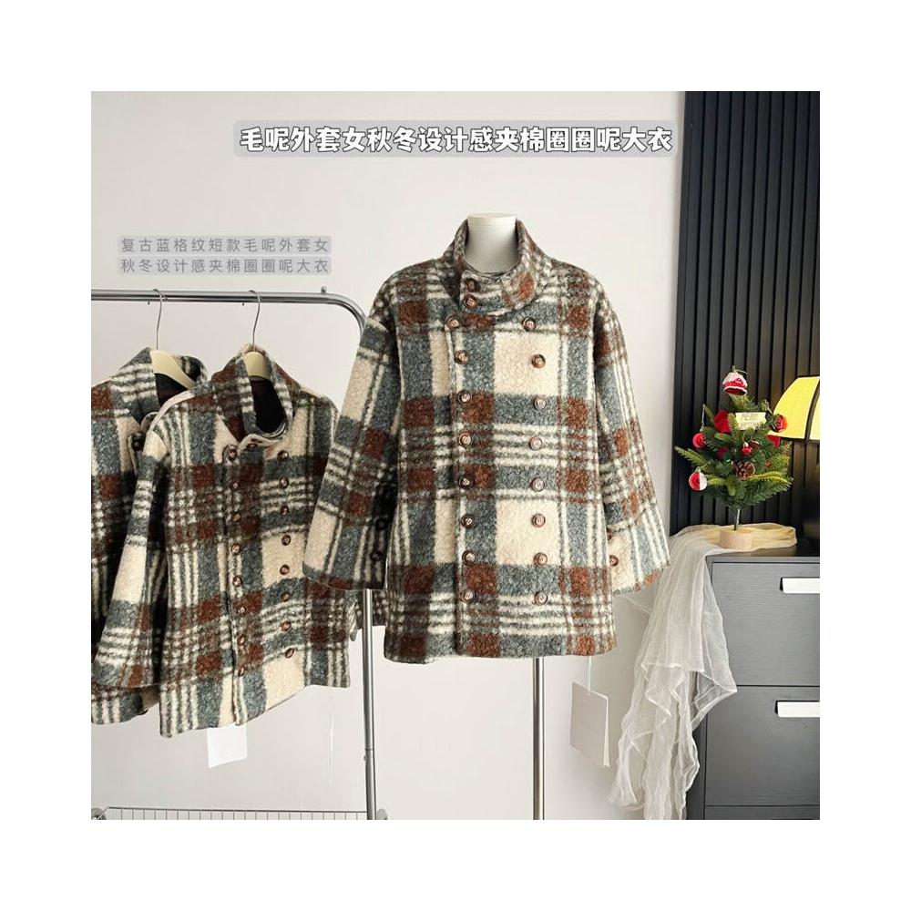 Seven七- ◆初雪 藍精靈 復古設計感格紋短款毛呢外套女加厚呢大衣