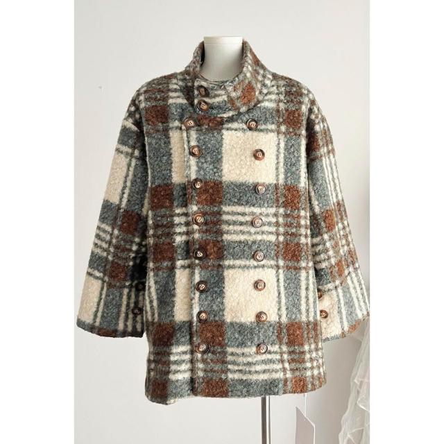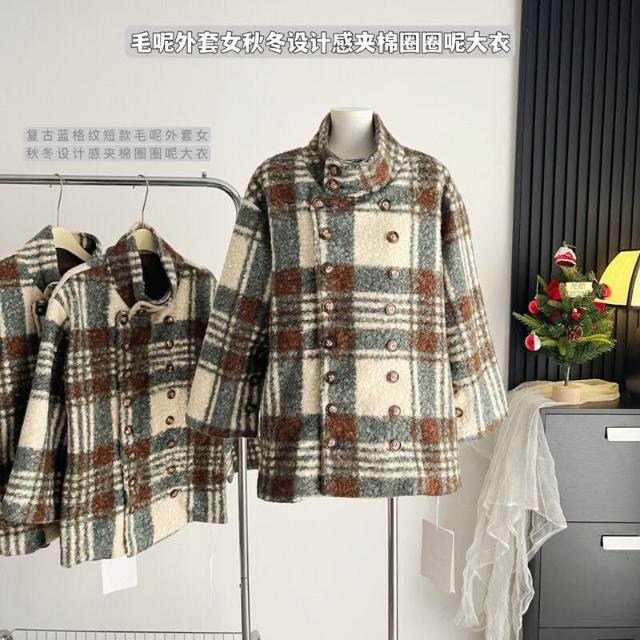Seven七- ◆初雪 藍精靈 復古設計感格紋短款毛呢外套女加厚呢大衣