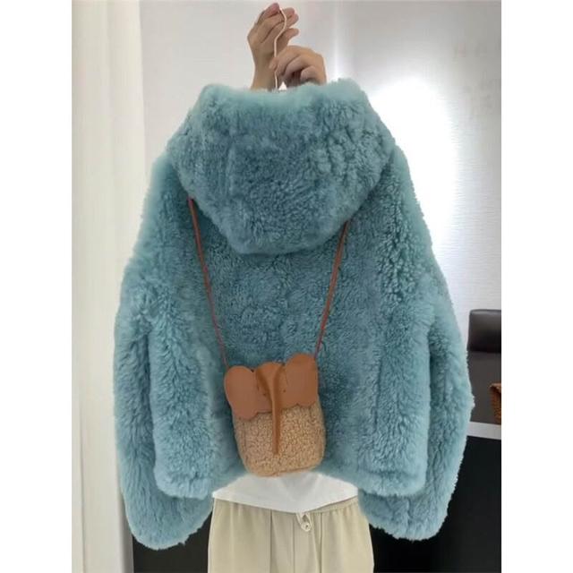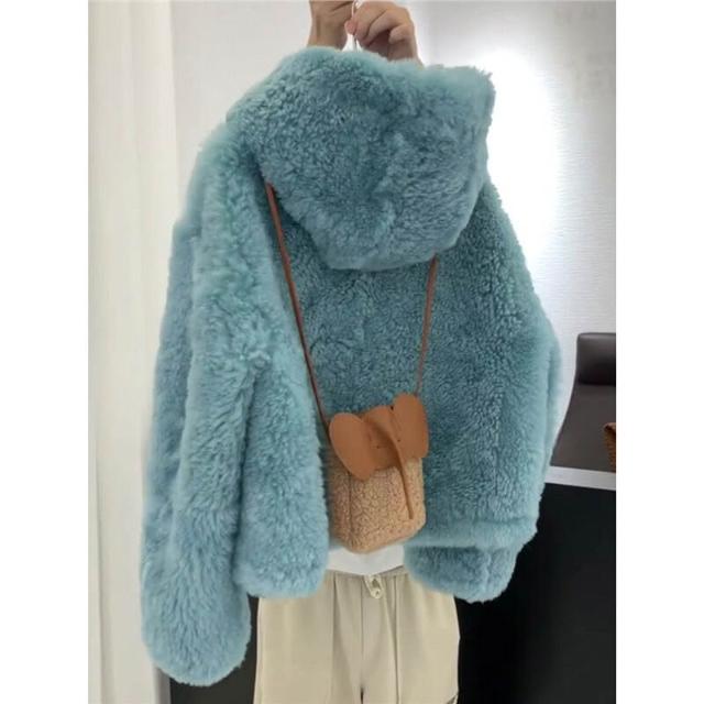 Seven七- 秋冬藍色羊羔毛外套韓系慵懶風小個子加厚連帽搖粒絨短款毛毛上衣