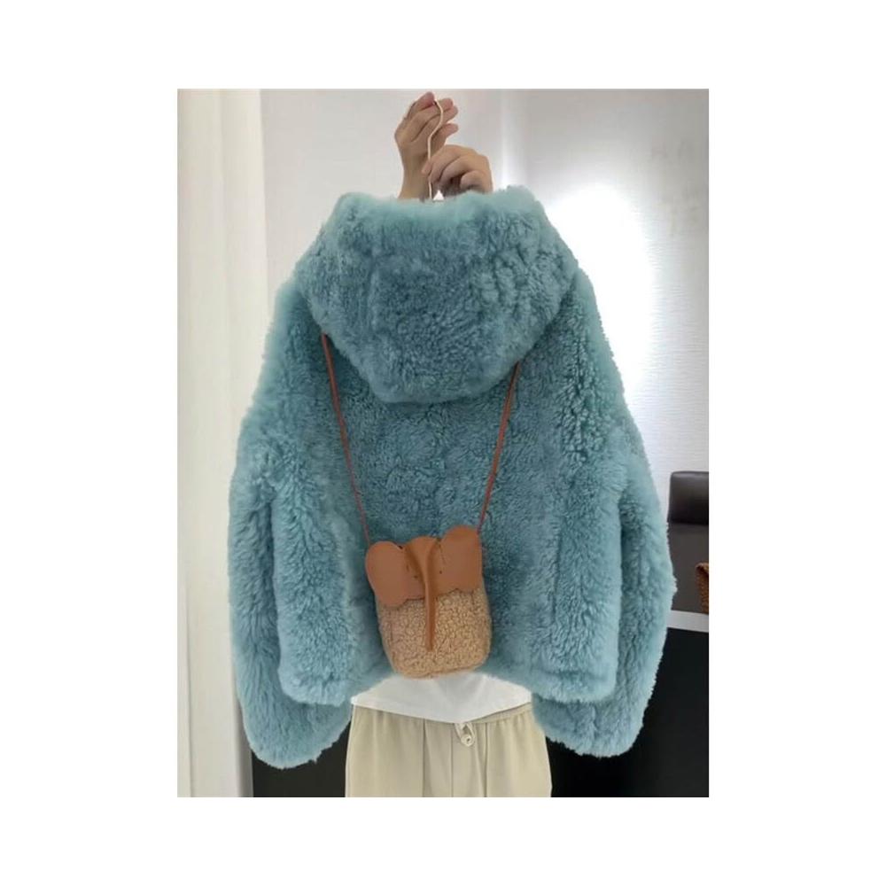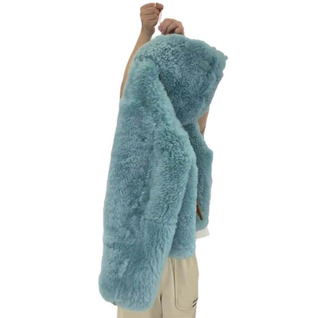 Seven七- 秋冬藍色羊羔毛外套韓系慵懶風小個子加厚連帽搖粒絨短款毛毛上衣