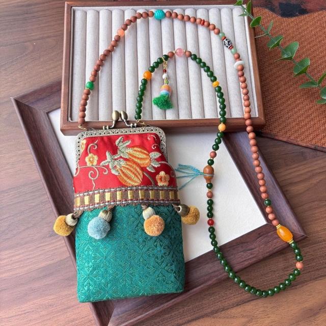 Seven七- 精緻手工宋錦刺繡手機包串珠新中式串珠重工斜挎包旗袍漢服配飾女