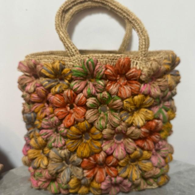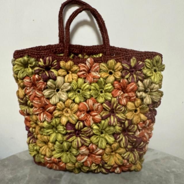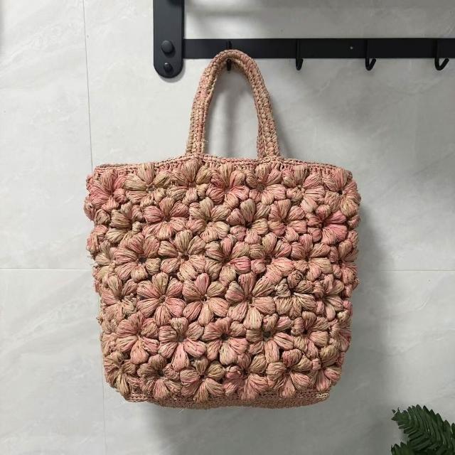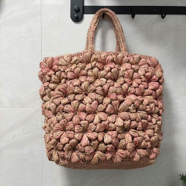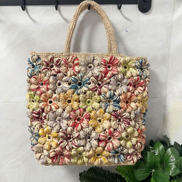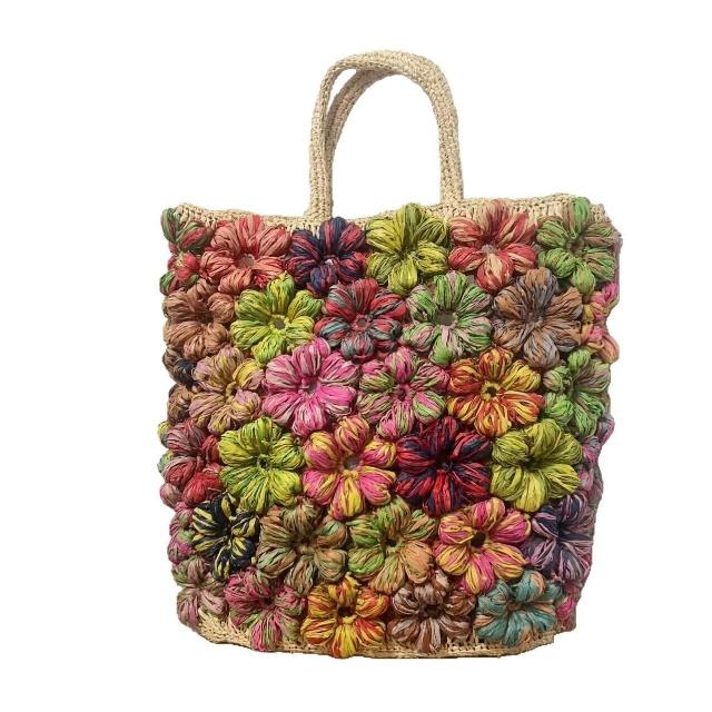 Seven七- 高品質拉菲草手提包撞色手工花朵編織包熱賣小眾多彩度假風沙灘包