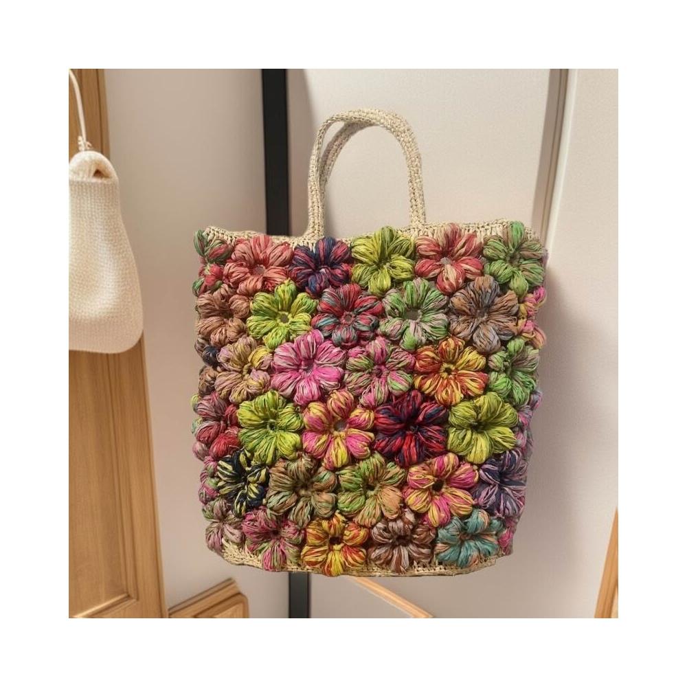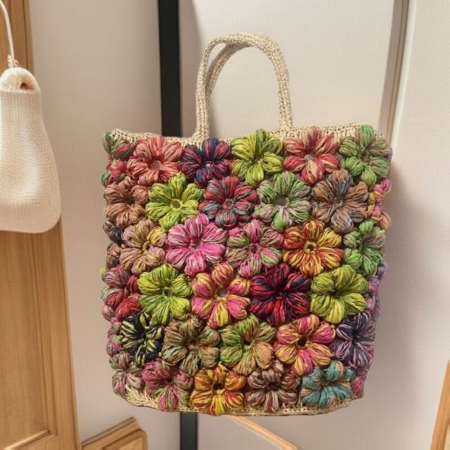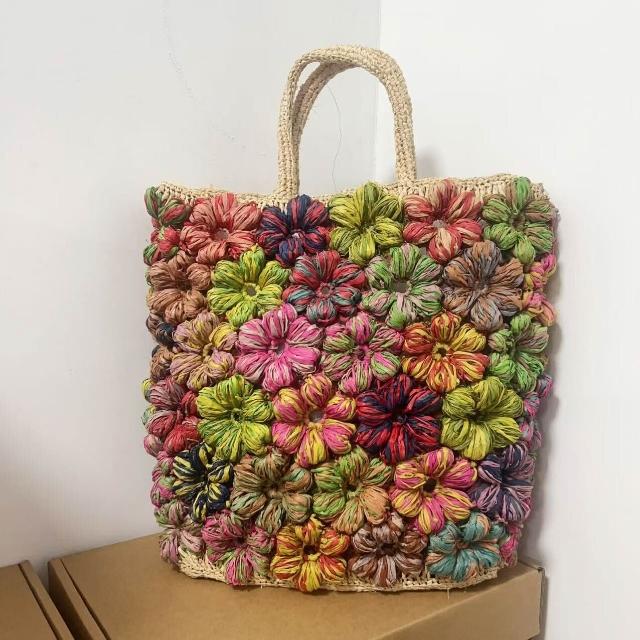 Seven七- 高品質拉菲草手提包撞色手工花朵編織包熱賣小眾多彩度假風沙灘包