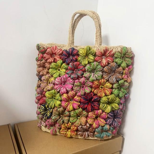 Seven七- 高品質拉菲草手提包撞色手工花朵編織包熱賣小眾多彩度假風沙灘包