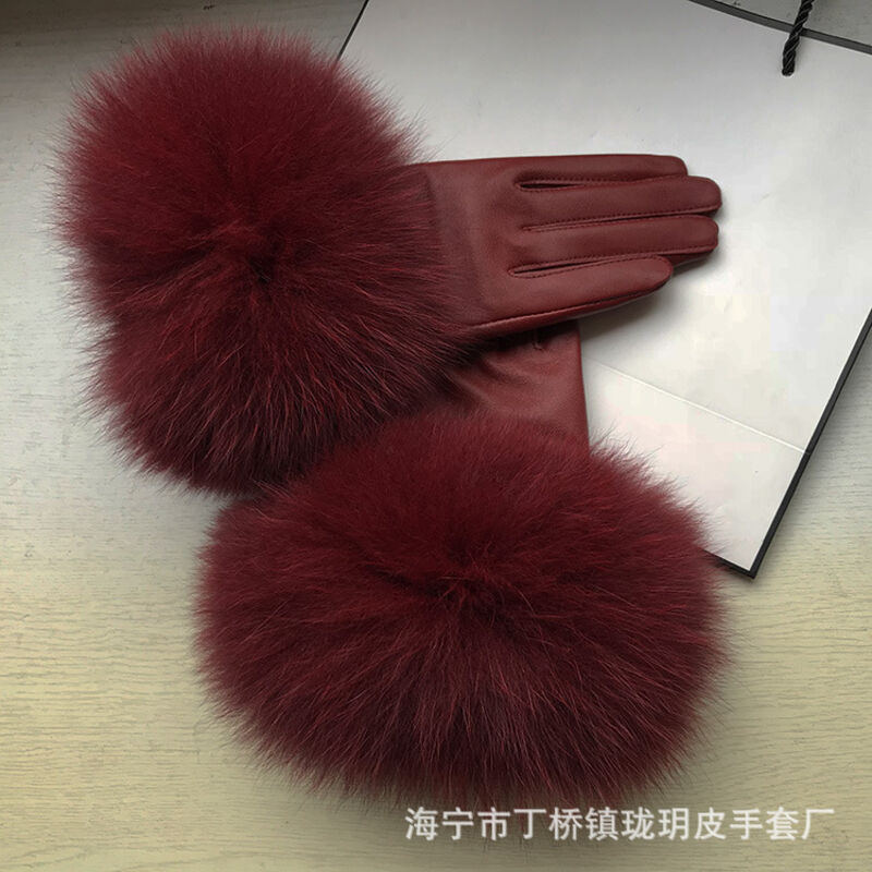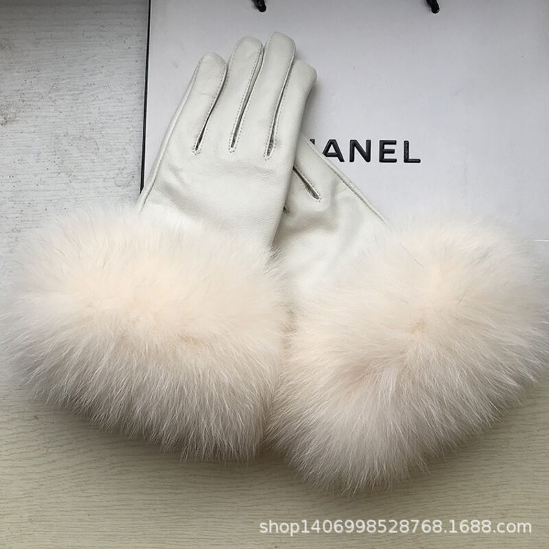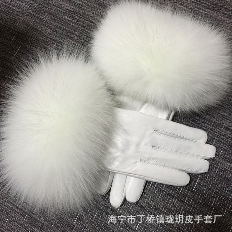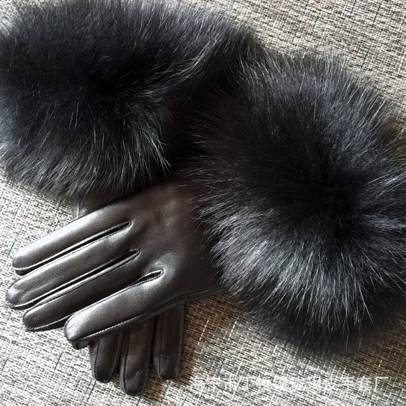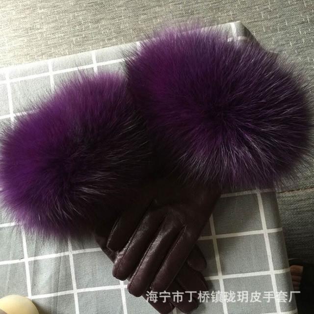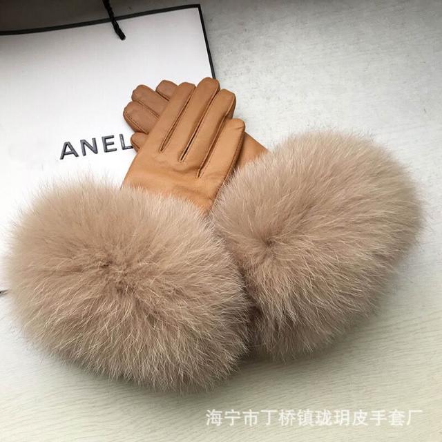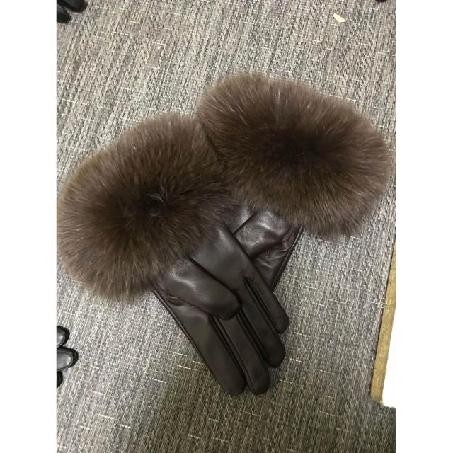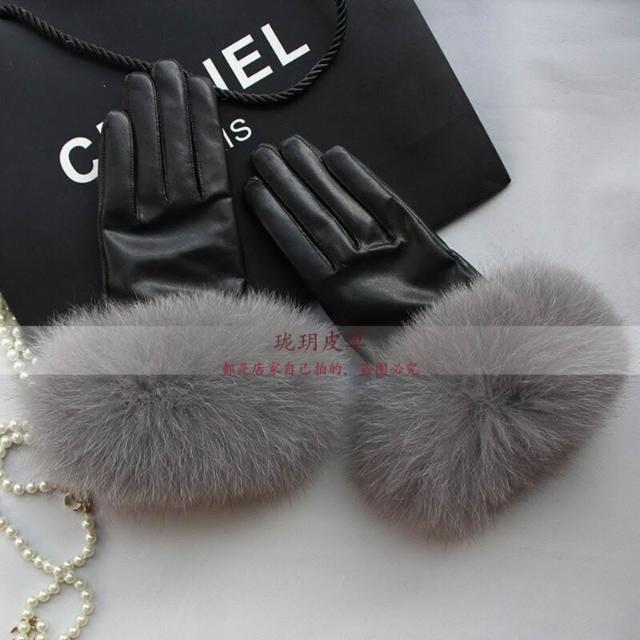Seven七- 真皮手套女士冬季保暖狐貍毛口手套袖口高檔品牌皮手套