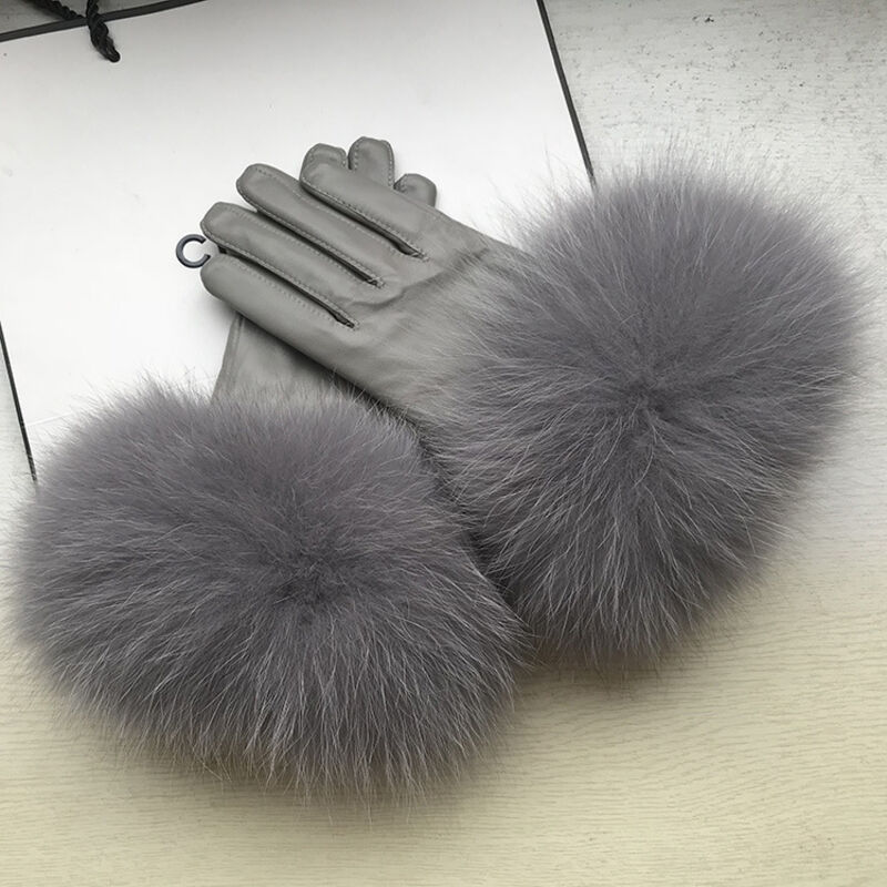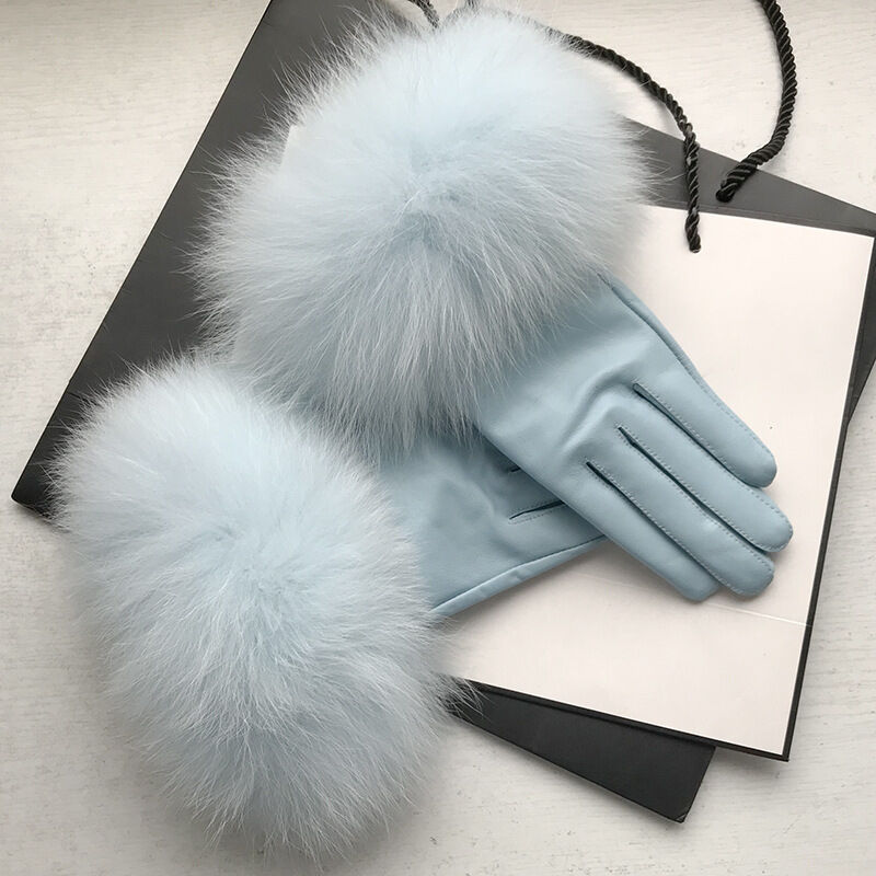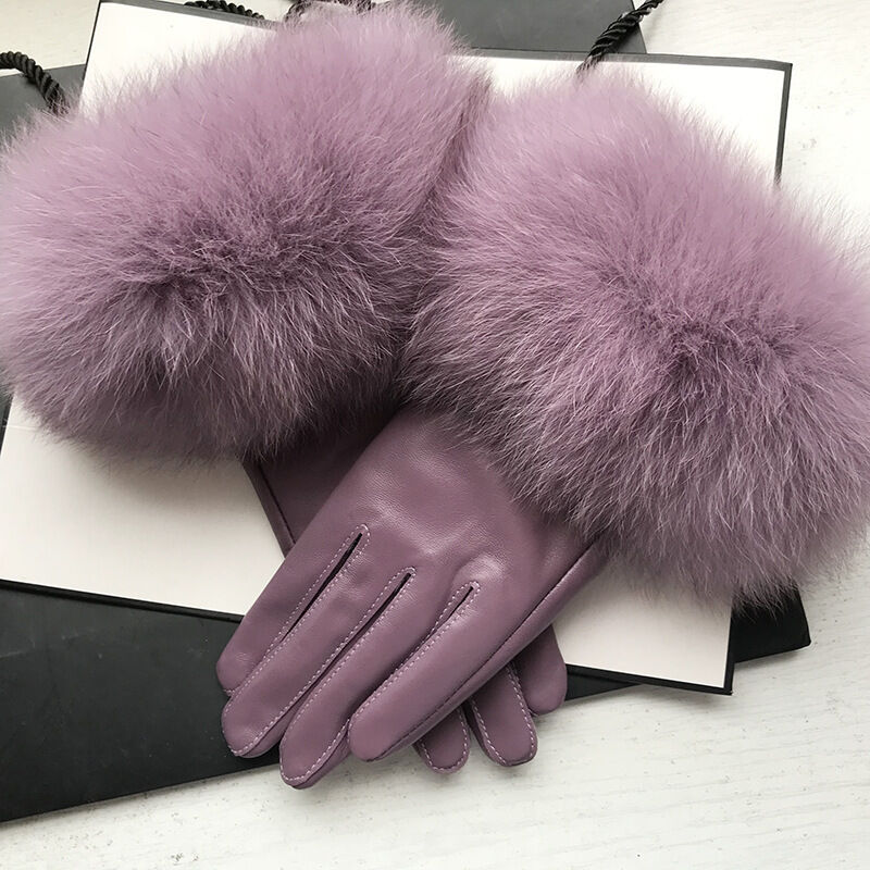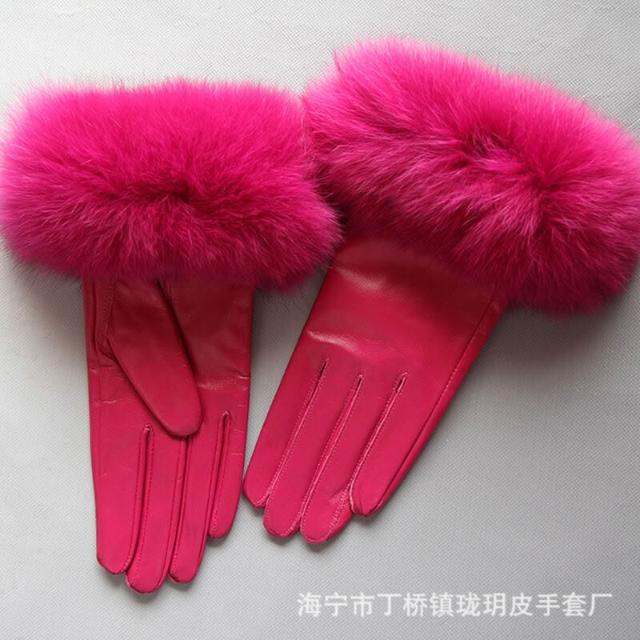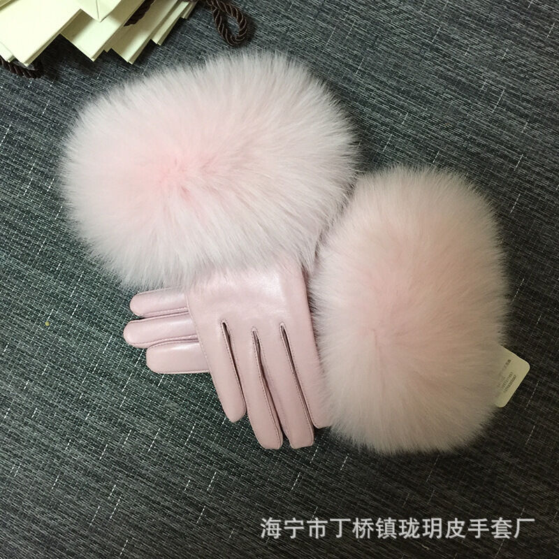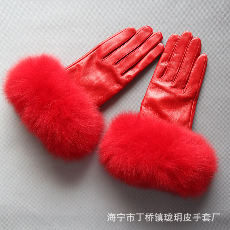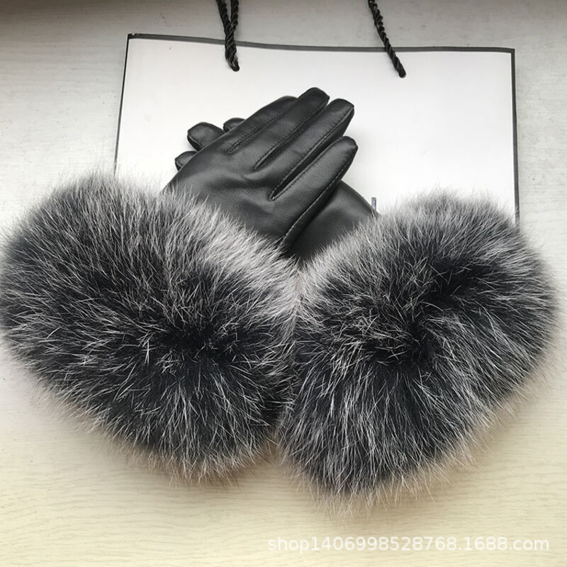 Seven七- 真皮手套女士冬季保暖狐貍毛口手套袖口高檔品牌皮手套