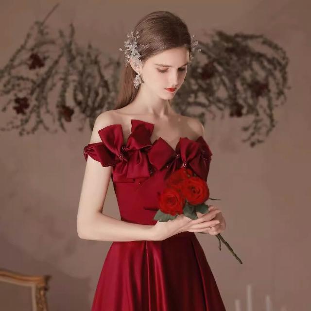 Seven七- 一字肩敬酒服2026新款宴會酒紅色晚禮服主持洋氣長裙新娘結婚訂婚