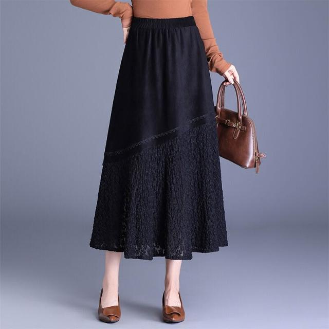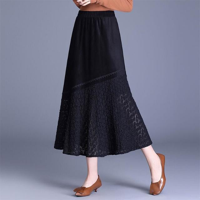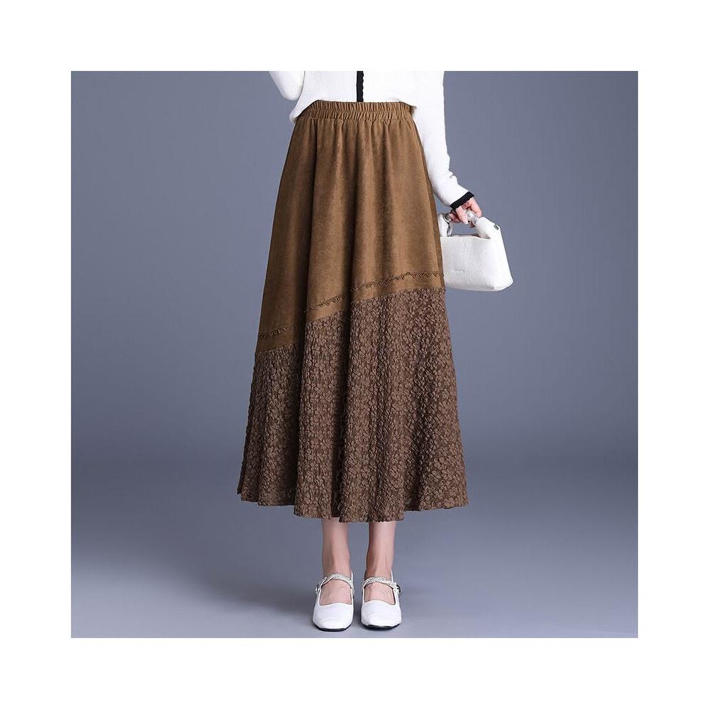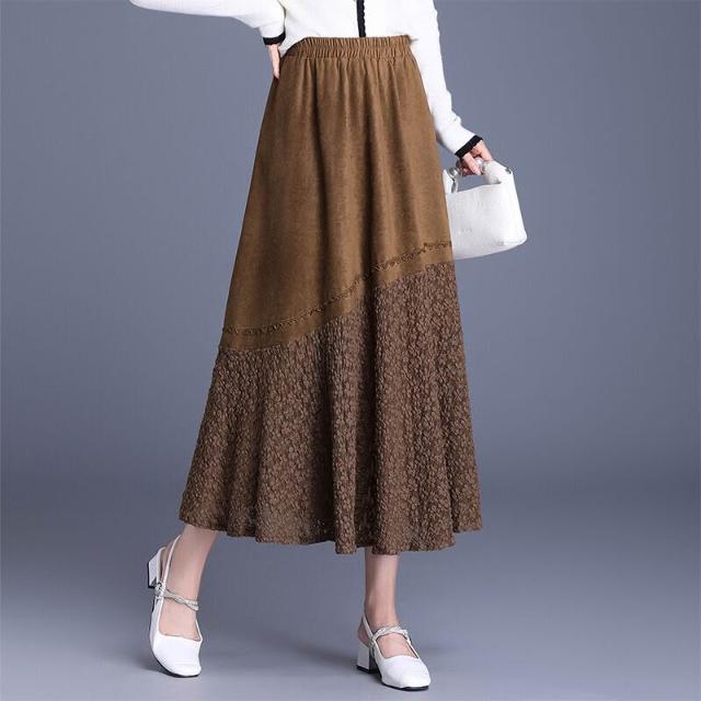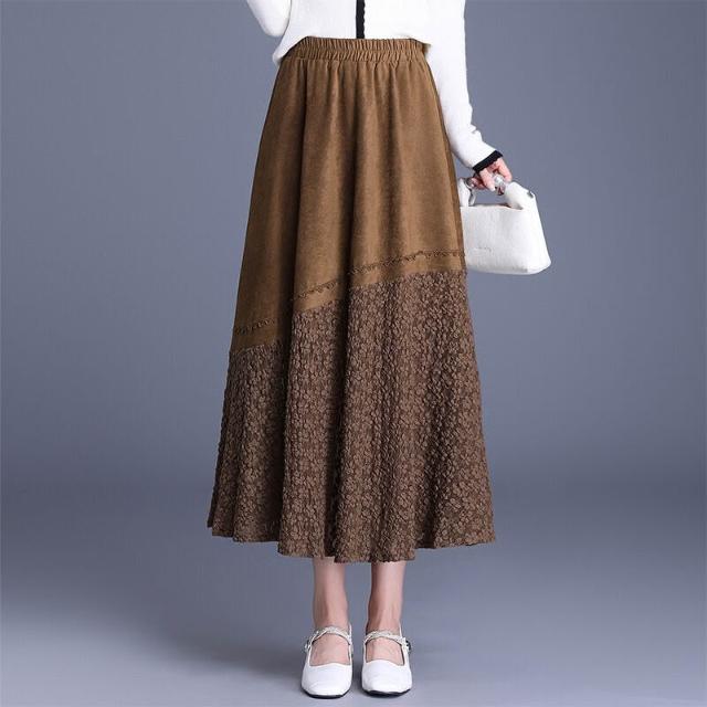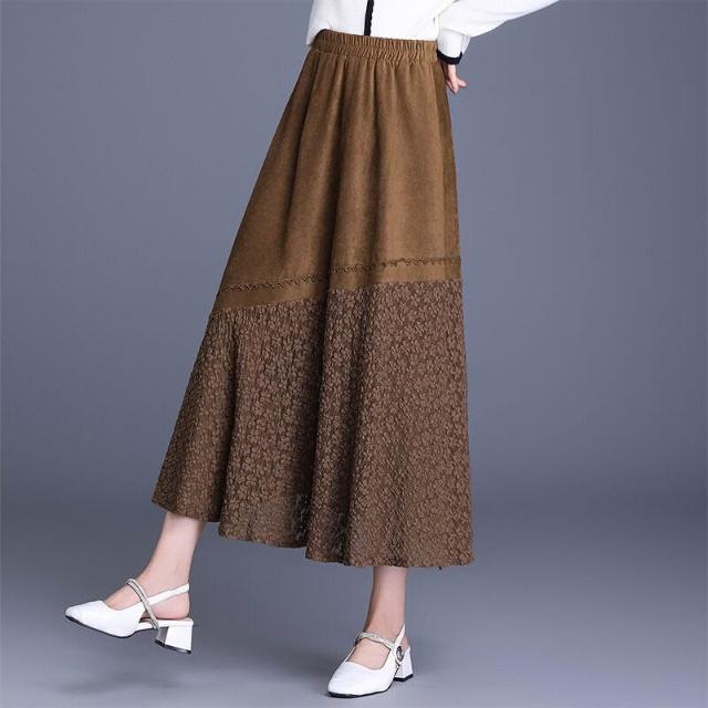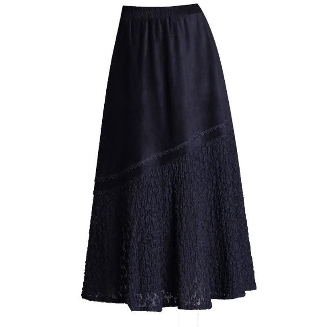 Seven七- 復古麂皮絨拼接蕾絲大擺半身裙女秋季2026新款高腰顯瘦裙長裙半裙
