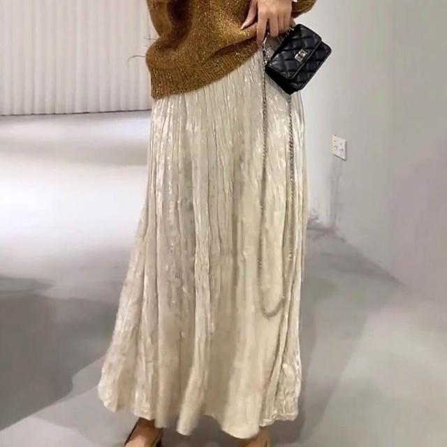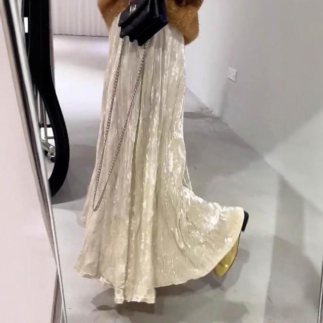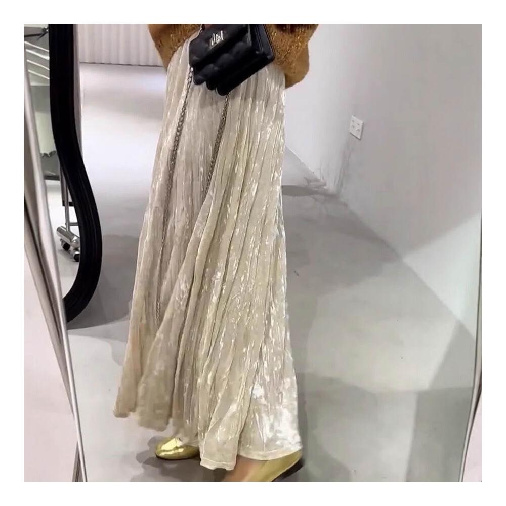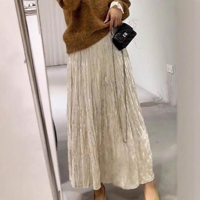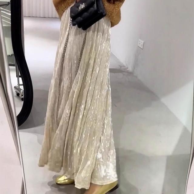 Seven七- 杏色絲絨半身裙女秋冬季高腰顯瘦氣質垂墜感百搭褶皺設計A字長裙
