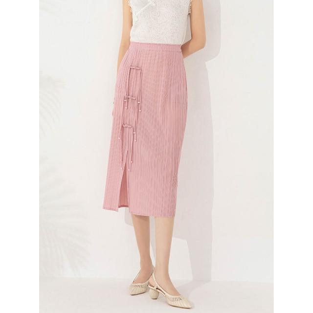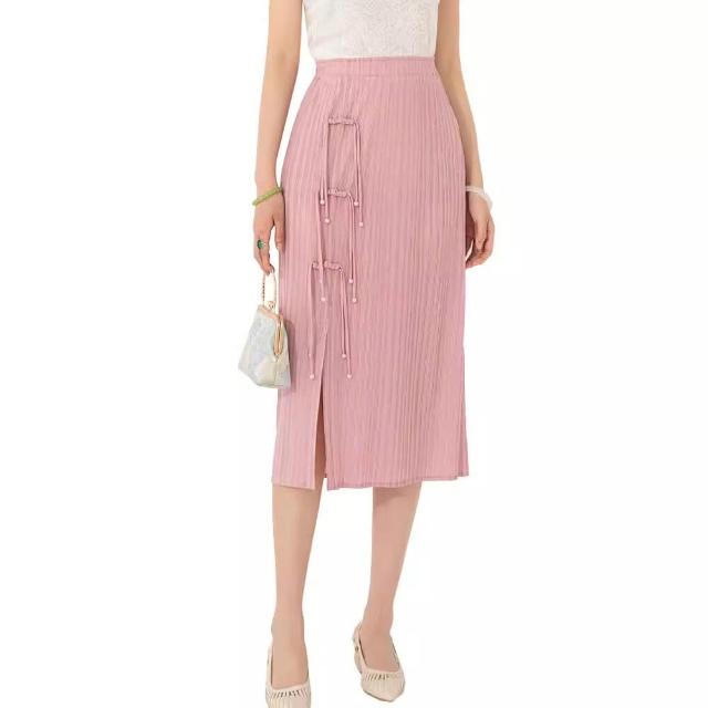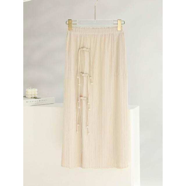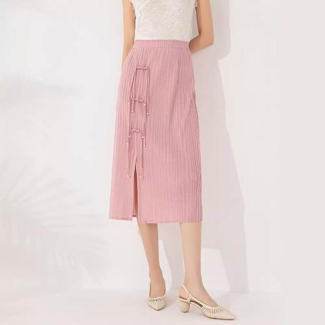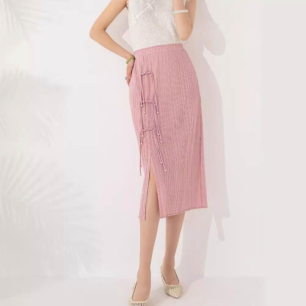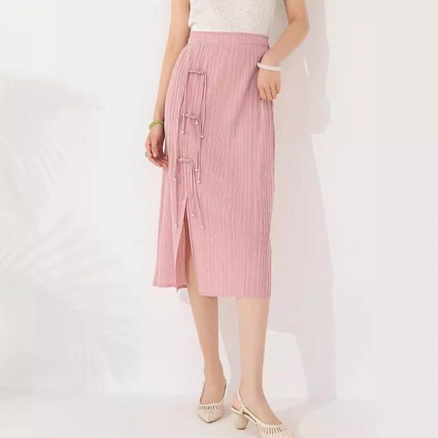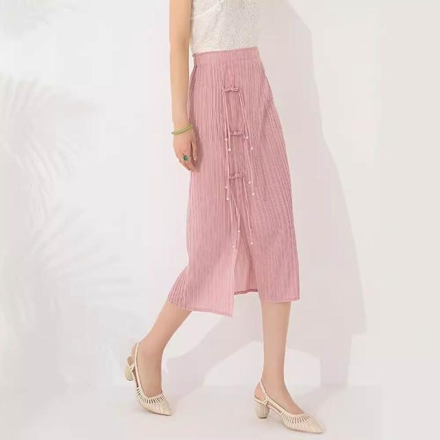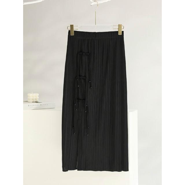 Seven七- 褶皺半身裙2026設計感小眾純色開叉盤扣復古中式中長裙女夏季新款
