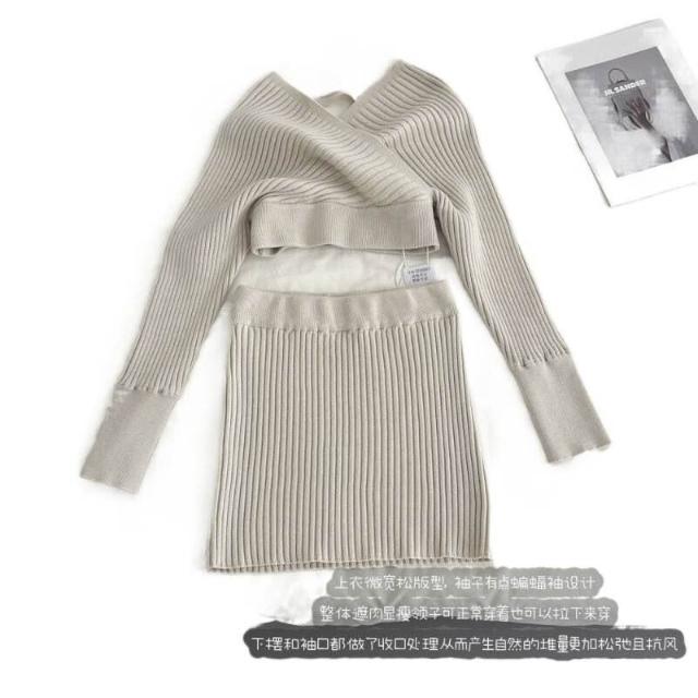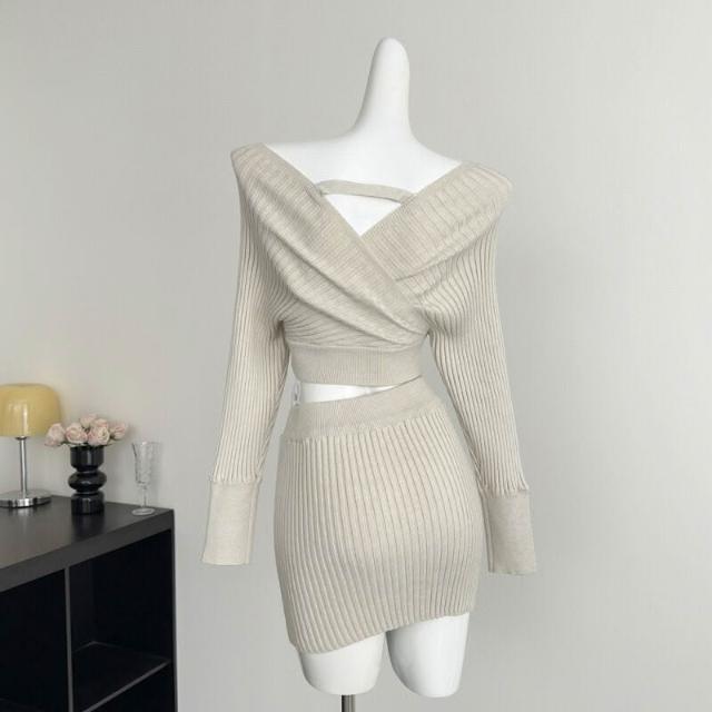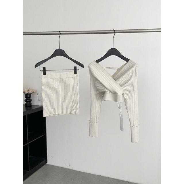 Seven七- 塞納2026春季新款韓系氣質V領一字肩長袖針織上衣包臀半裙套裝
