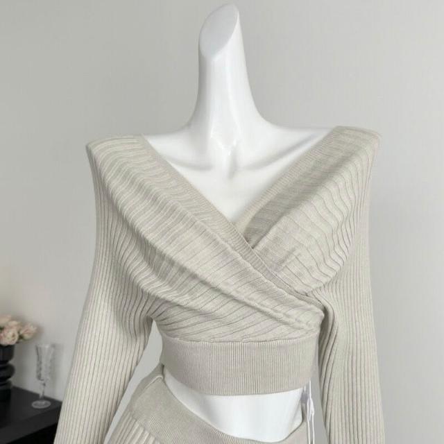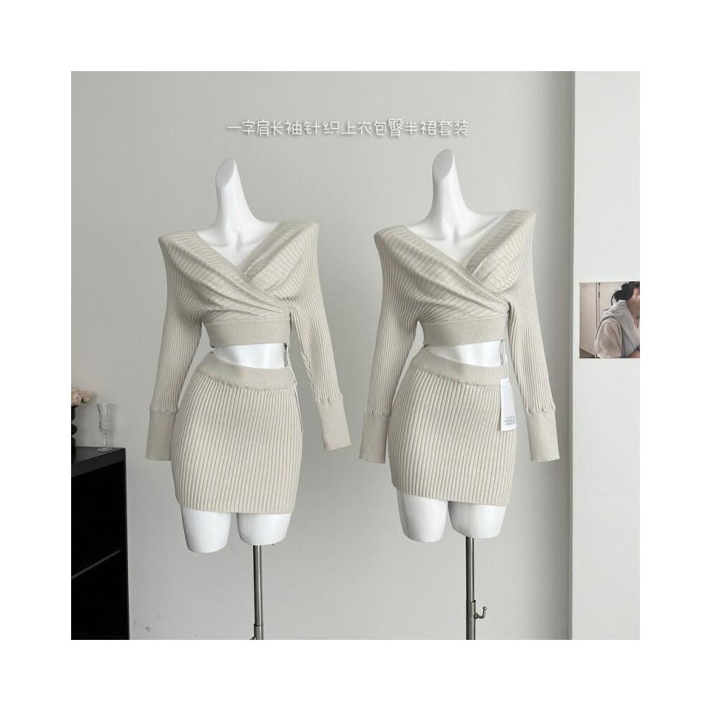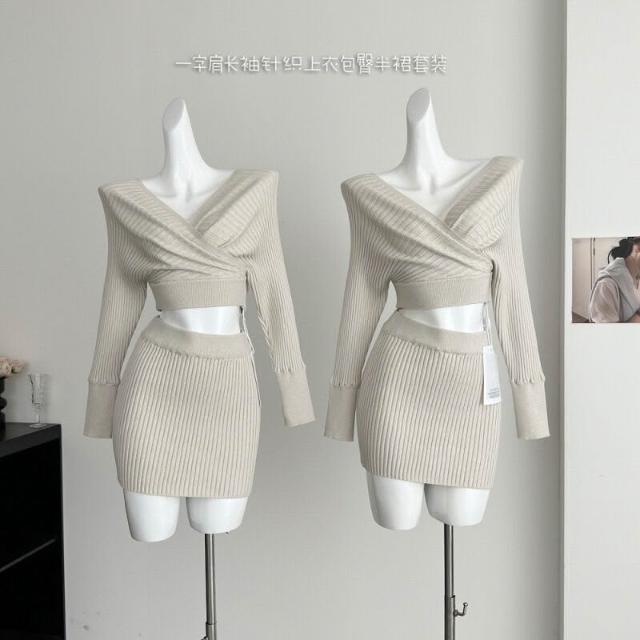 Seven七- 塞納2026春季新款韓系氣質V領一字肩長袖針織上衣包臀半裙套裝