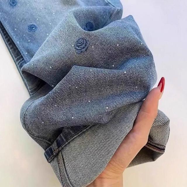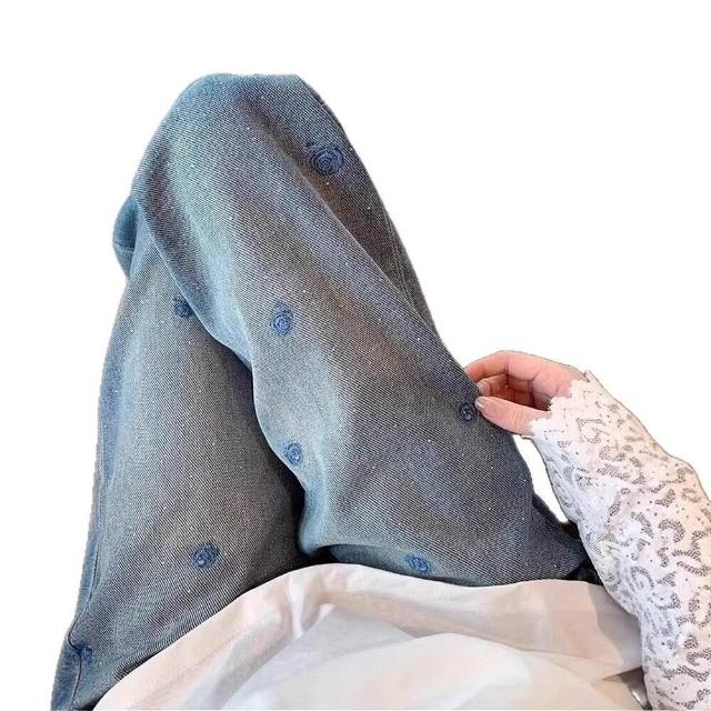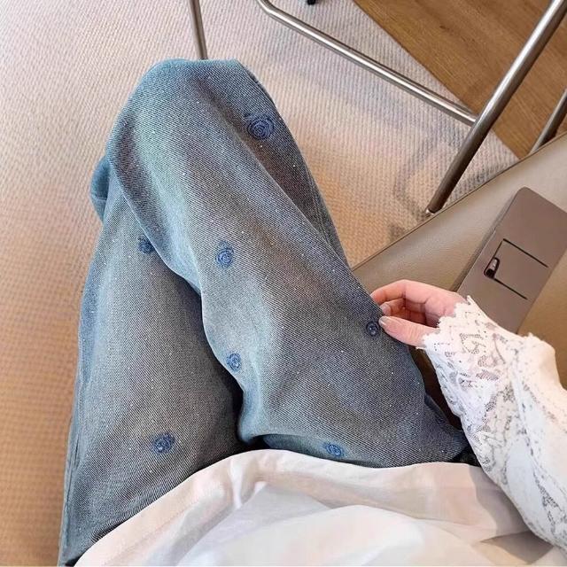 Seven七- 藍色 刺繡燙鉆牛仔褲女2026 年秋季 新款 小個子 垂感 拖地闊腿褲