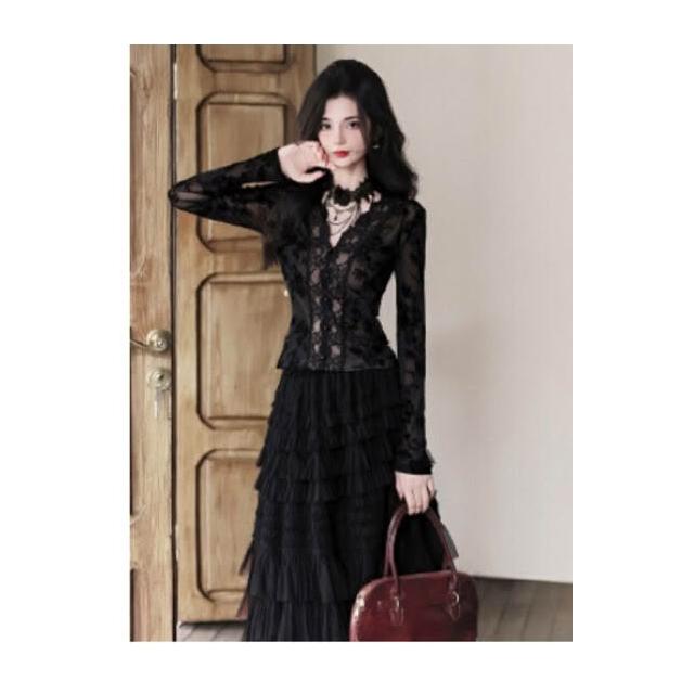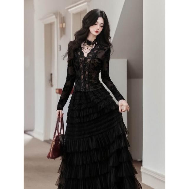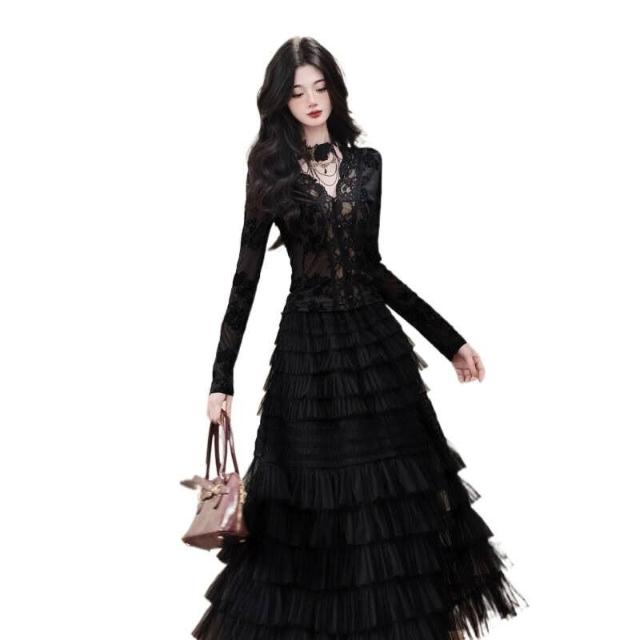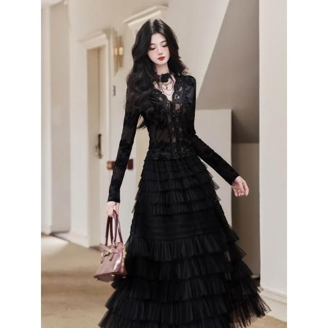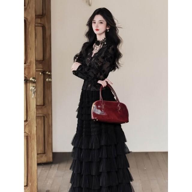 Seven七- 赫本風穿搭一整套女裝秋冬2026年新款法式黑色蕾絲上衣搭配半身裙