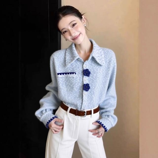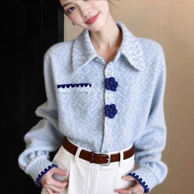 Seven七- 高端小資藍色加厚襯衫女秋冬獨特超好看減齡洋氣法式氣質保暖上衣
