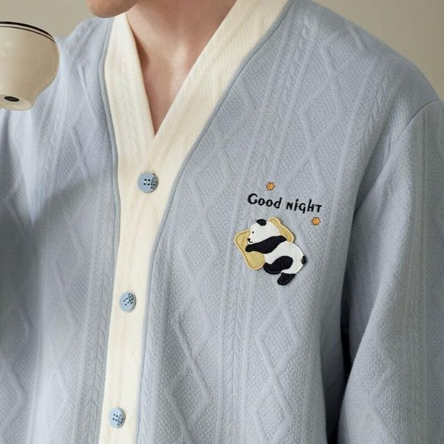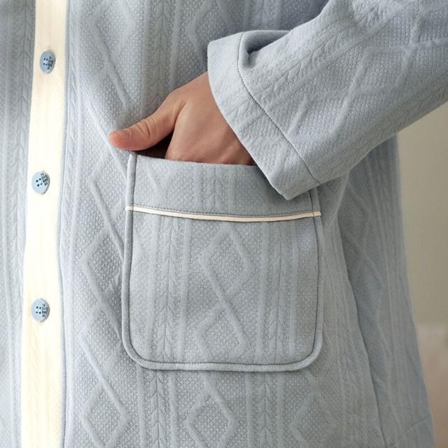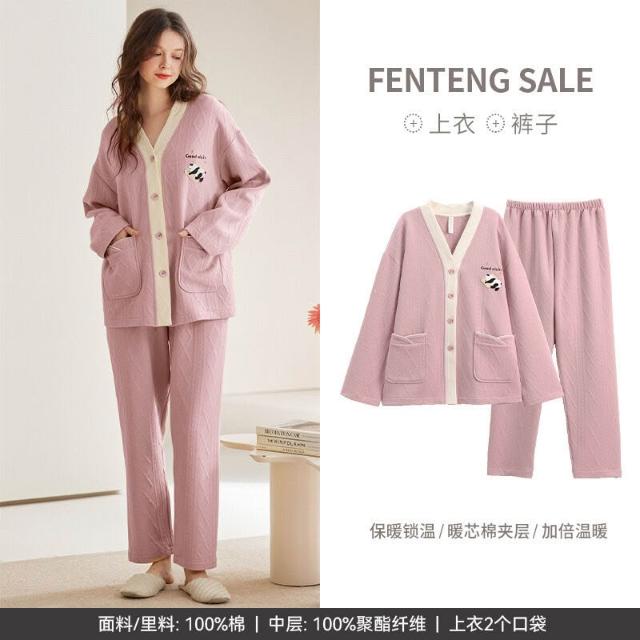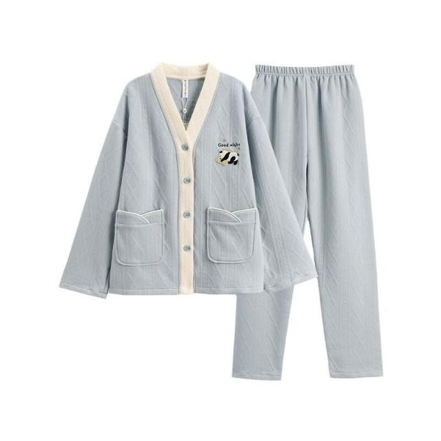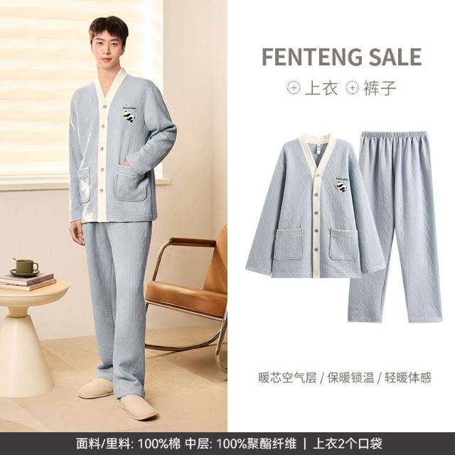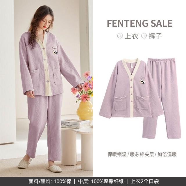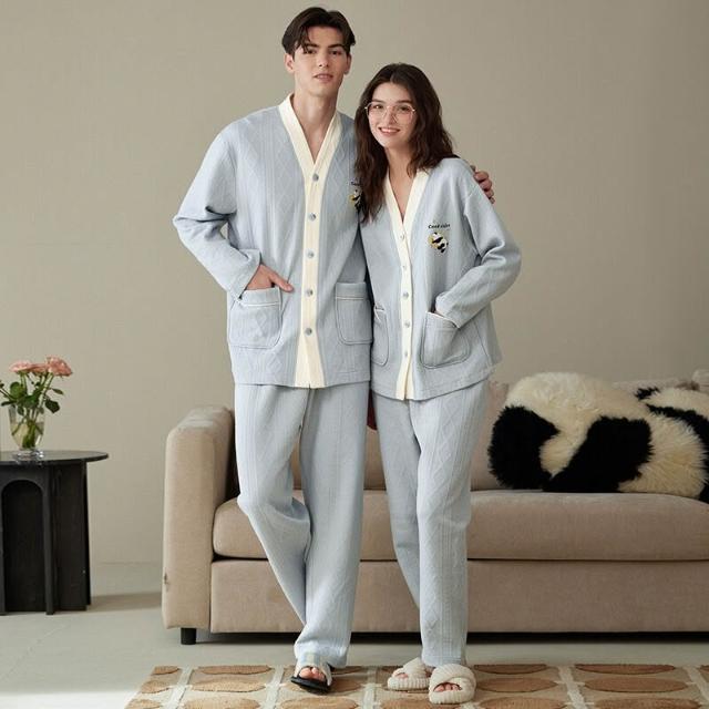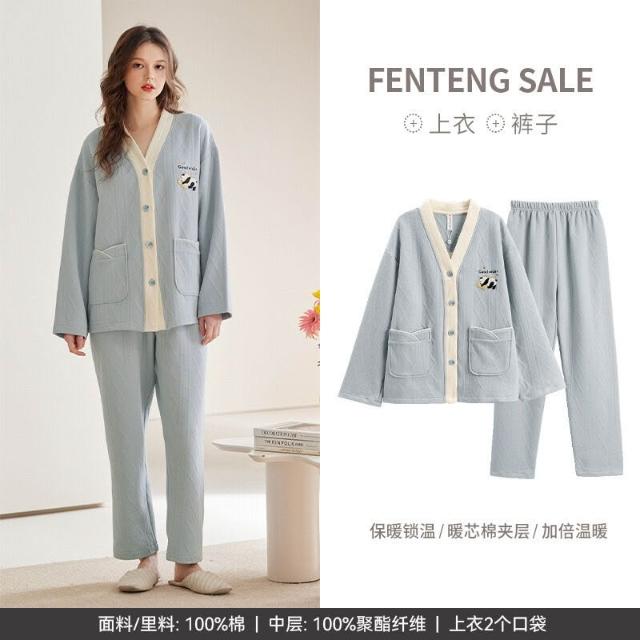 Seven七- 空氣棉夾層情侶睡衣純棉加厚長袖秋冬季套裝大碼可外穿家居服