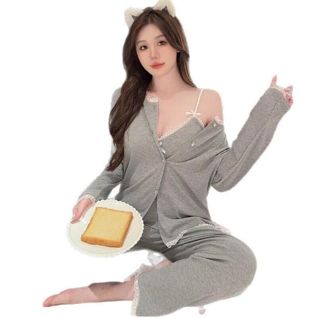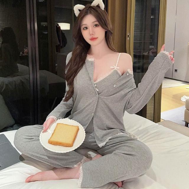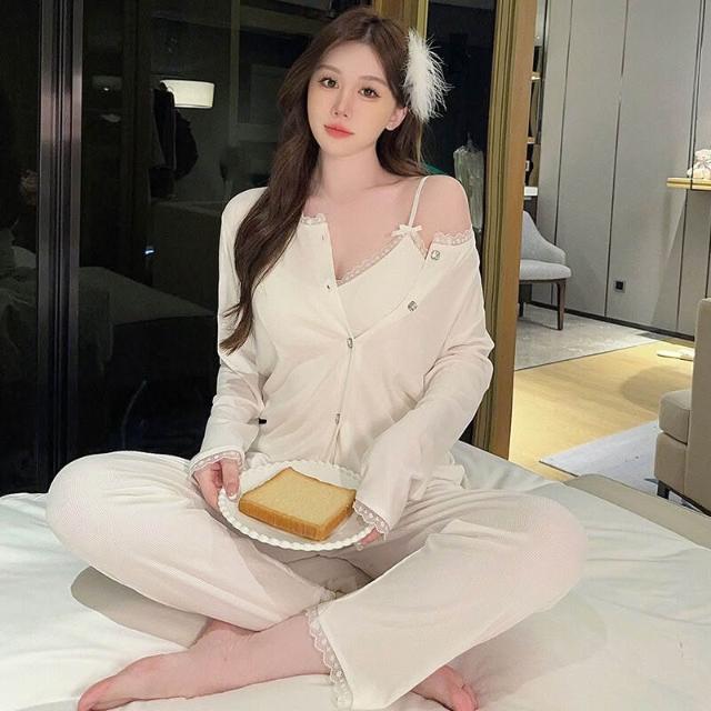 Seven七- 莫代爾棉三件套睡衣女春夏季純欲性感吊帶長袖長褲家居服帶胸墊