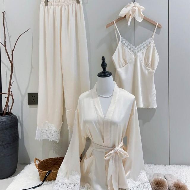 Seven七- 四件套性感睡衣內衣緞面吊帶蕾絲睡衣女式家居服睡袍系帶浴袍套裝