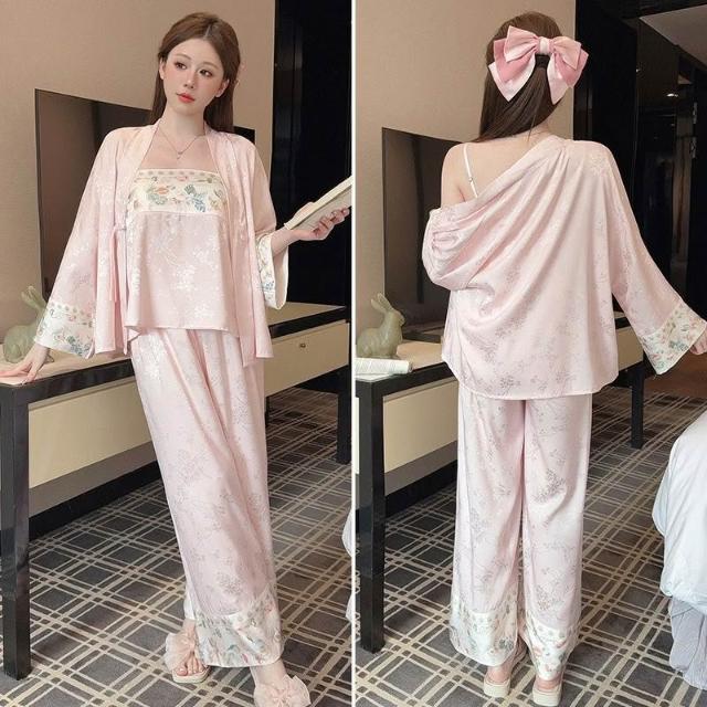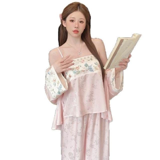 Seven七- 帶胸墊冰絲睡衣女新中式吊帶開衫長褲三件套高級.家居服可外穿