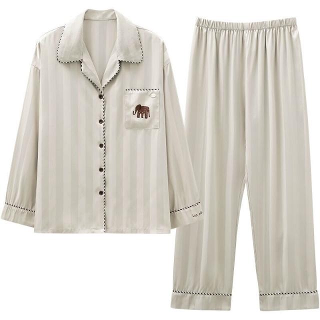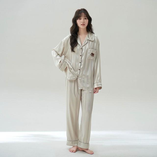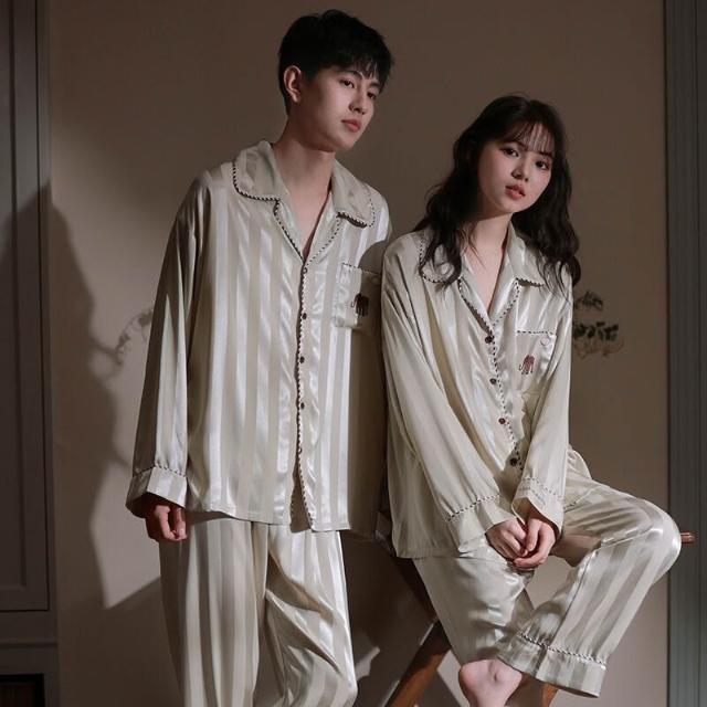 Seven七- 情侶睡衣女春夏新款卡通涼感冰絲條紋長袖男士輕奢家居服