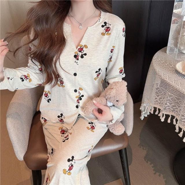 Seven七- 睡衣女春夏秋莫代爾棉老鼠性感舒適V領長袖長褲套裝加胸棉家居服