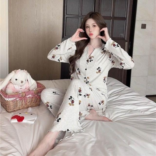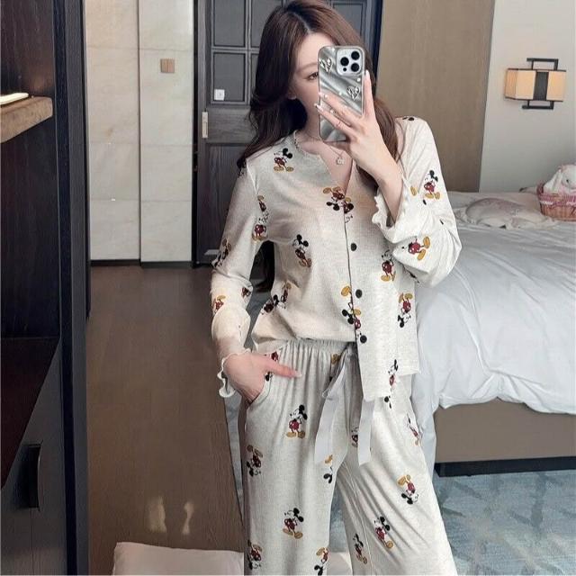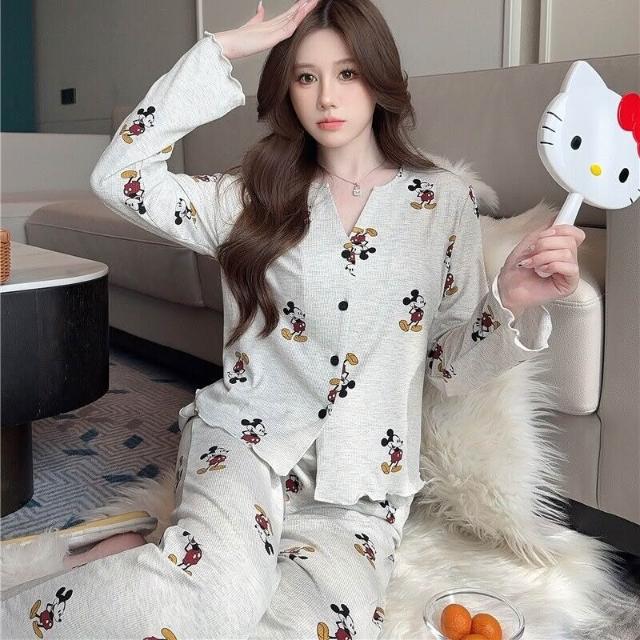 Seven七- 睡衣女春夏秋莫代爾棉老鼠性感舒適V領長袖長褲套裝加胸棉家居服