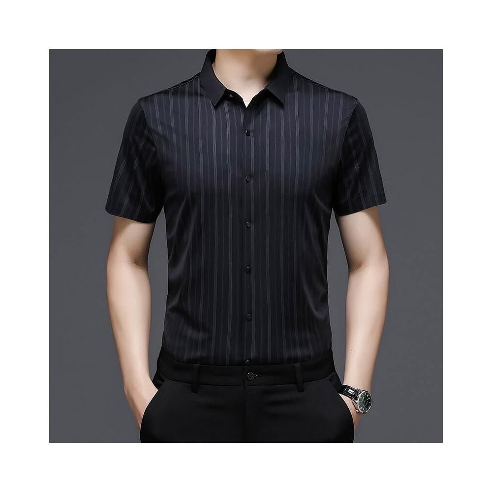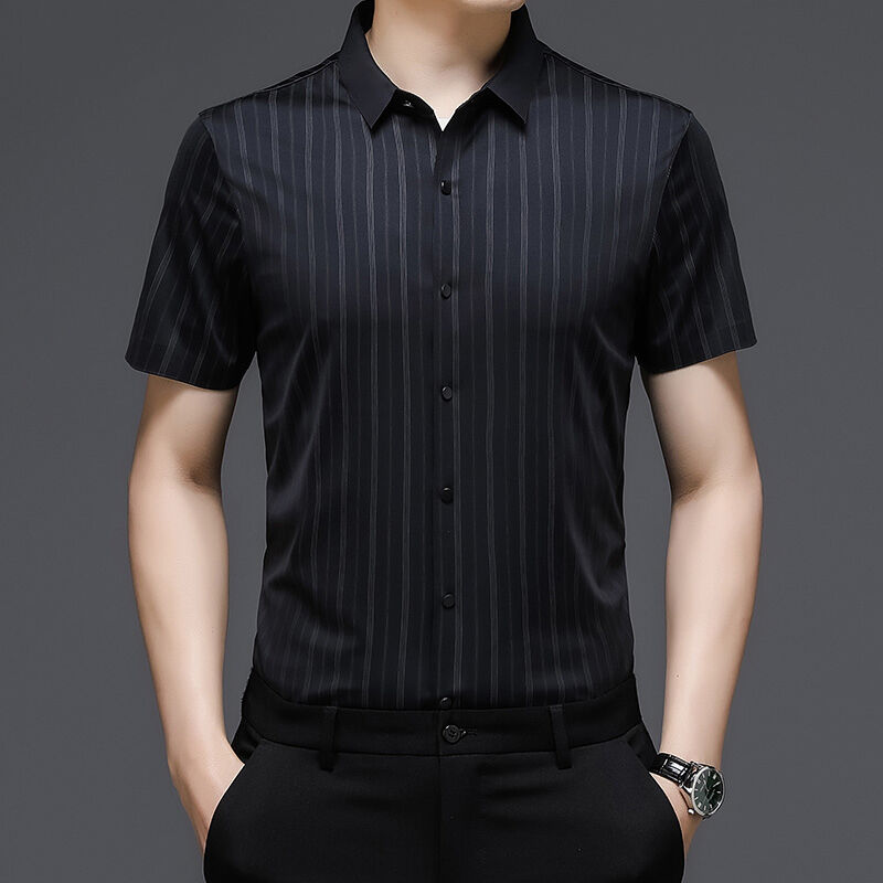 Seven七- 條紋襯衫男夏季桑蠶絲短袖襯衣男士高端抗皺免燙休閑男爸爸裝襯衫