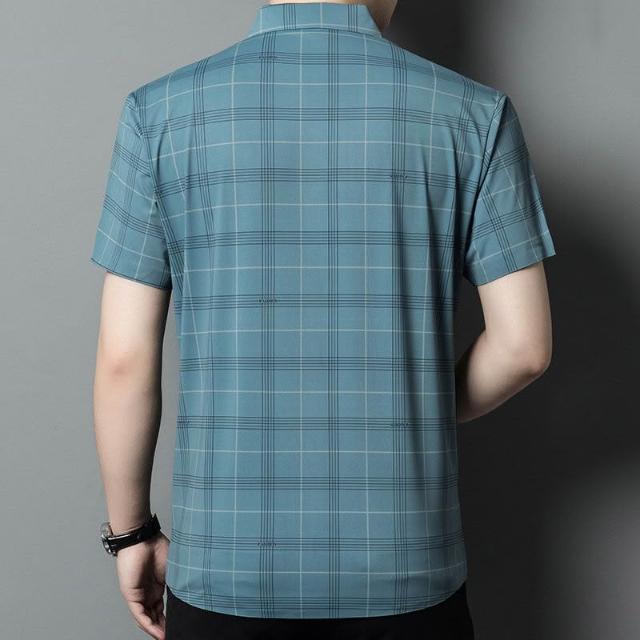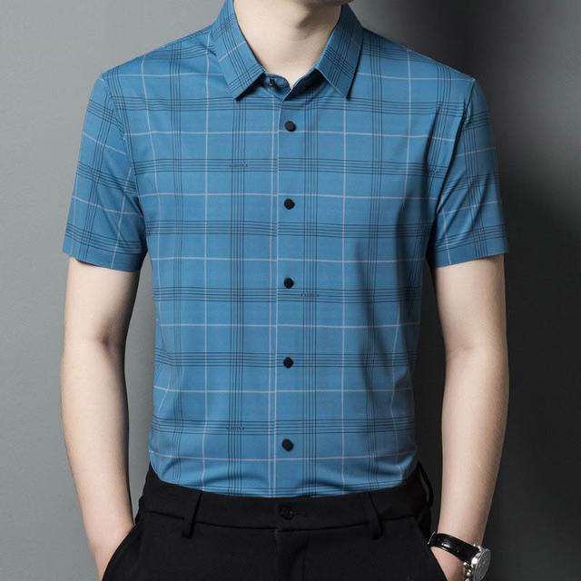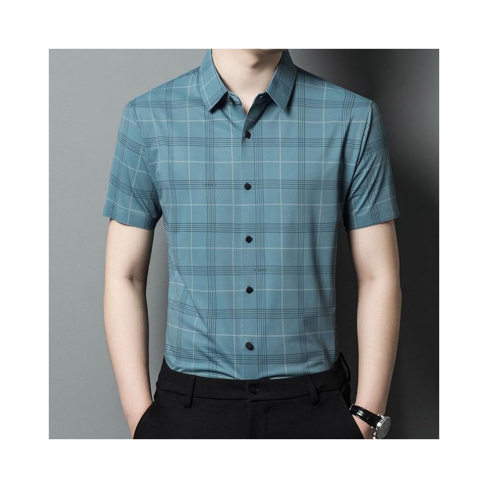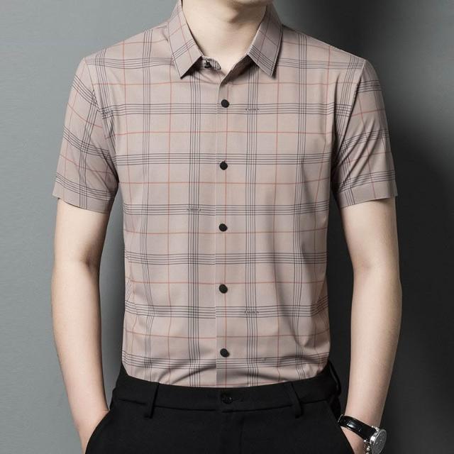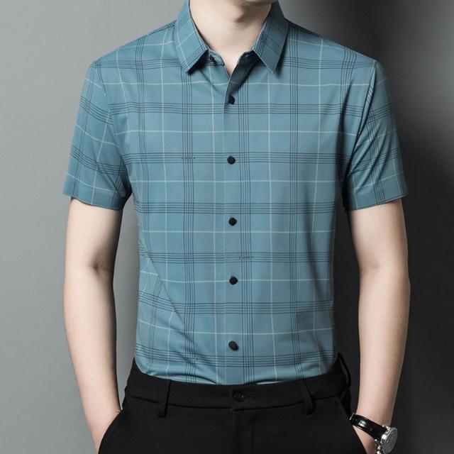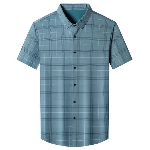 Seven七- 短袖襯衫男士夏季薄款商務休閑寬松免燙爸爸裝格子印花無痕襯衣