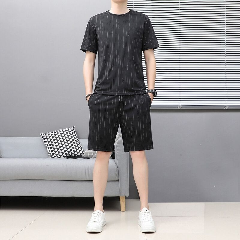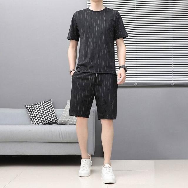 Seven七- 夏季男士圓領短袖T恤韓版潮流冰絲帥氣休閑百搭運動寬松兩件套裝