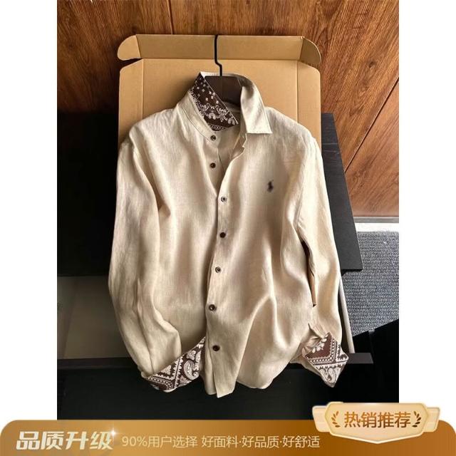 Seven七- 老錢風原麻色腰果花刺繡襯衫男士輕薄松弛感度假休閑亞麻防曬襯衣