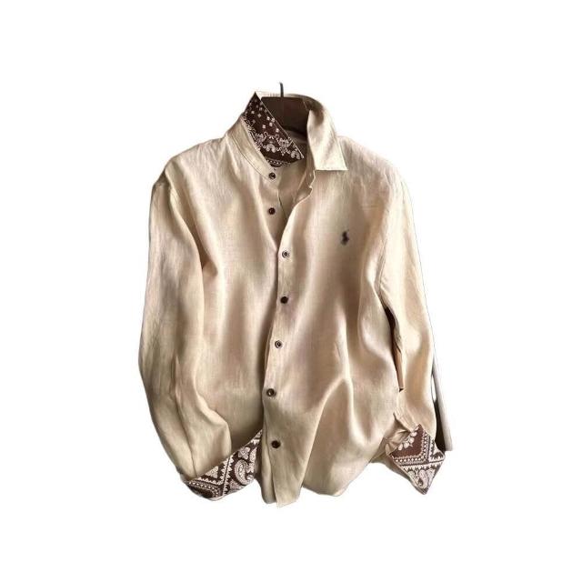 Seven七- 老錢風原麻色腰果花刺繡襯衫男士輕薄松弛感度假休閑亞麻防曬襯衣