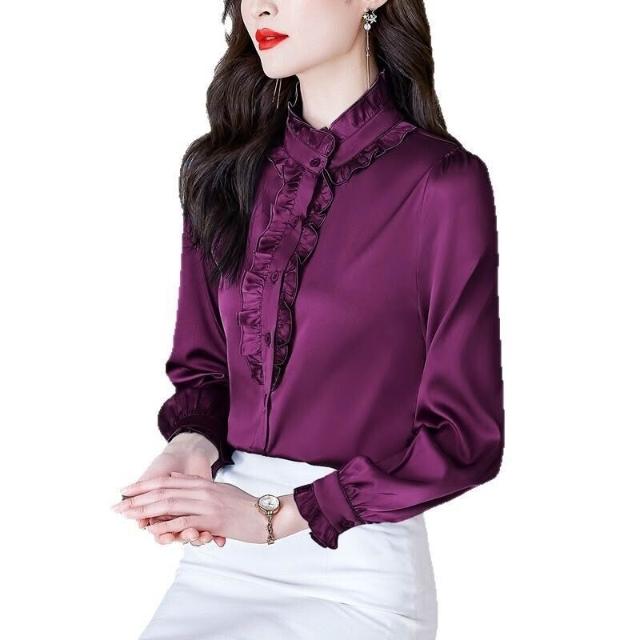 Seven七- 2026新款木耳領邊桑蠶絲荷葉邊襯衣高品質立領職業襯衫女洋氣上衣