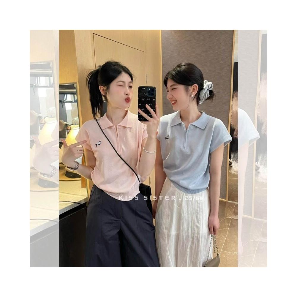 Seven七- 韓系藍色半拉鏈polo領針織短袖t恤女夏季小個子短款冰絲上衣正肩