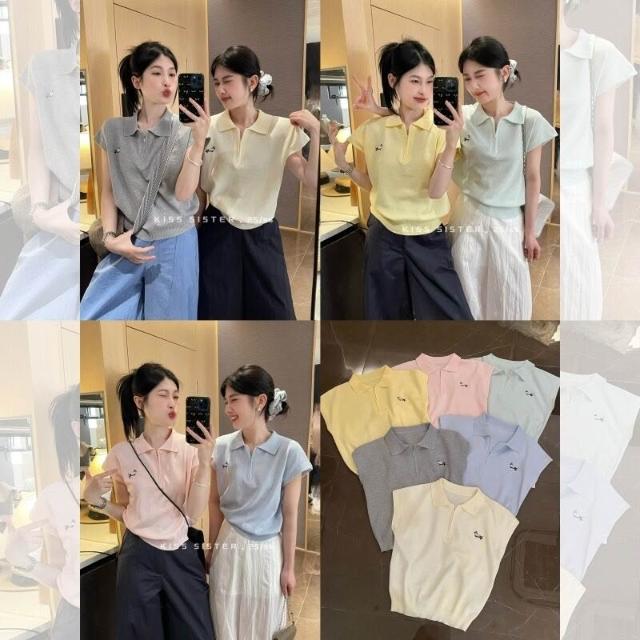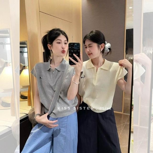 Seven七- 韓系藍色半拉鏈polo領針織短袖t恤女夏季小個子短款冰絲上衣正肩