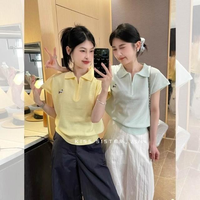 Seven七- 韓系藍色半拉鏈polo領針織短袖t恤女夏季小個子短款冰絲上衣正肩