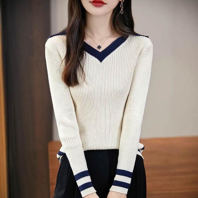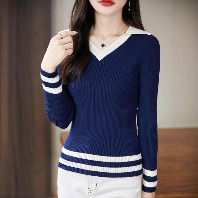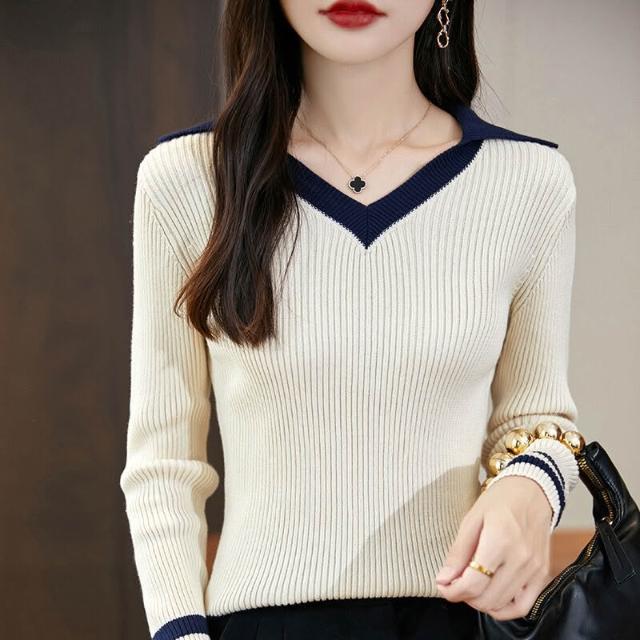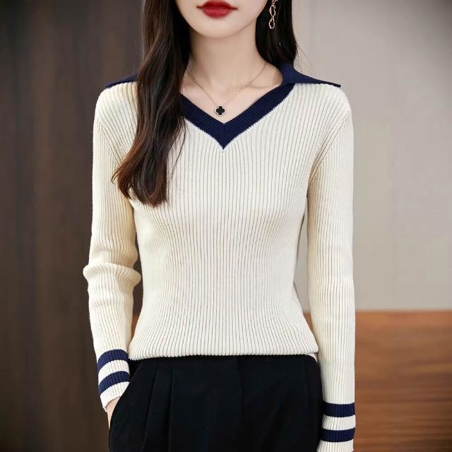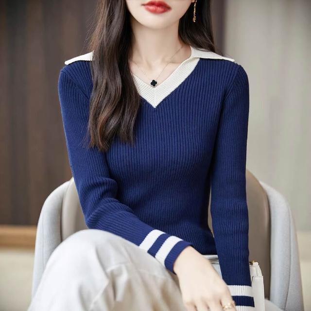 Seven七- 新款純棉線翻領針織衫2026年春秋長袖抽條修身拼色套頭打底衫上衣