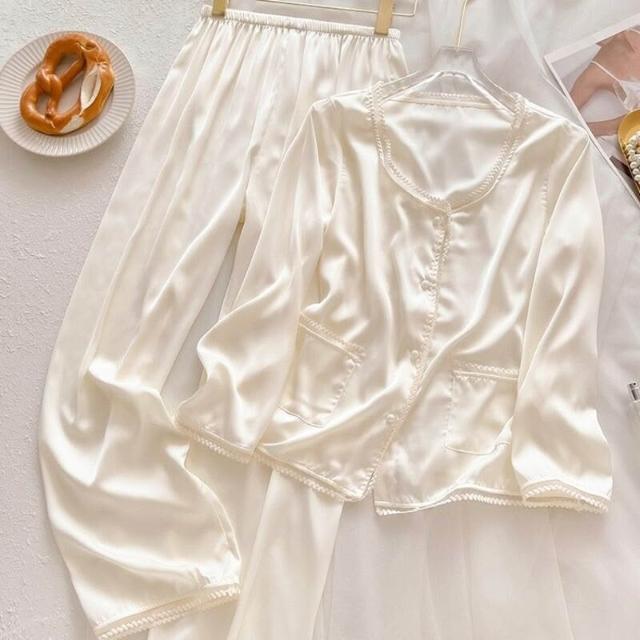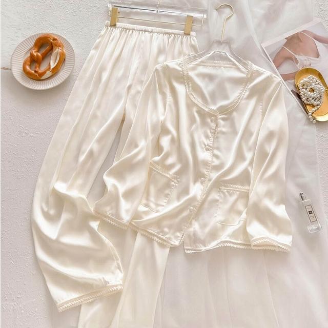 Seven七- 真絲睡衣女款春秋季長袖新款家居服白色感冬薄款桑蠶絲綢套裝