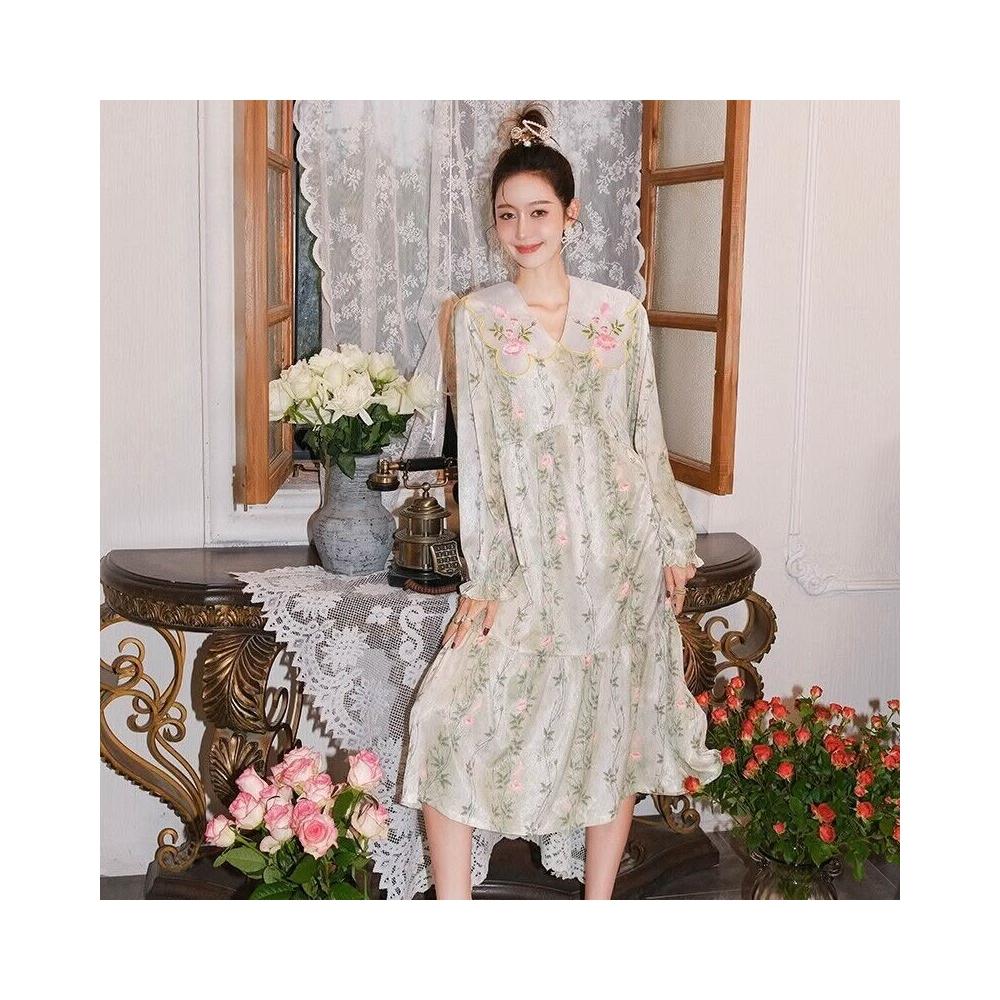 Seven七- 新款刺繡翻領仿真絲冰絲睡裙印花套頭綢緞睡衣短袖長裙可外穿春夏