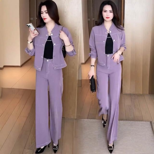 Seven七 時尚 休 閑 套裝 女春秋 新款 洋氣 減齡 顯瘦 立領 牛仔 短外套 闊腿褲 兩件套