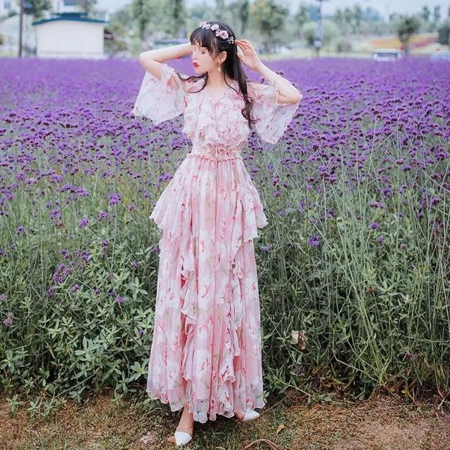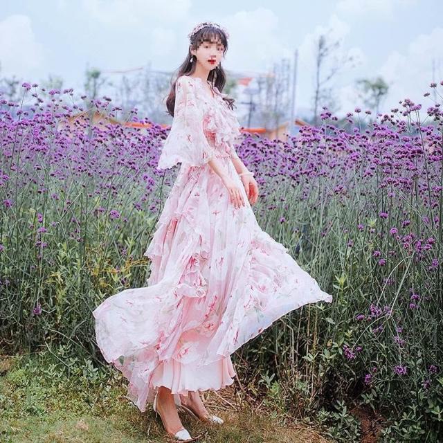 Seven七- 印花 雪紡 連衣裙 夏 顯瘦 荷葉邊 裙子 仙女 超仙 森系 顯瘦 長裙 度假沙灘裙