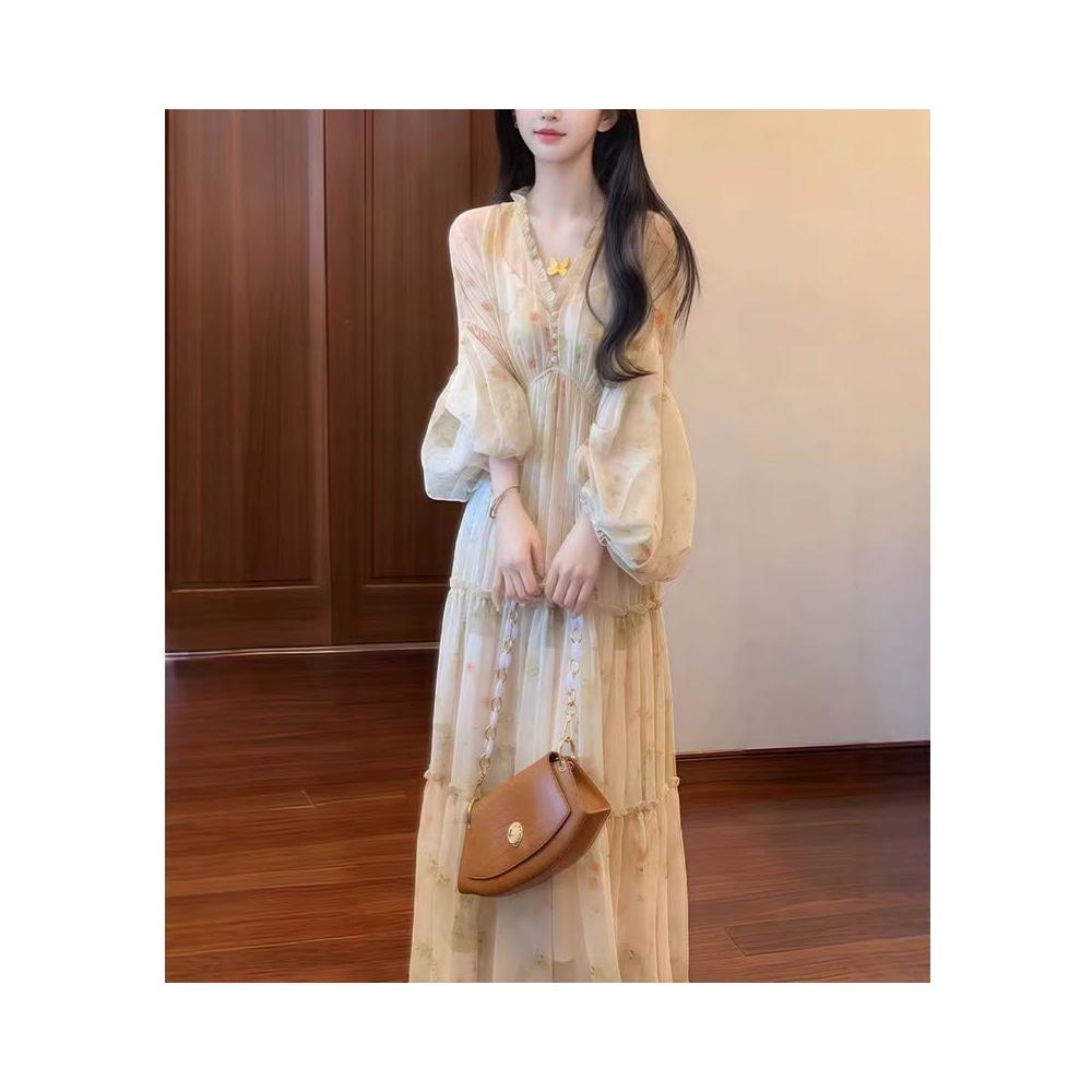 Seven七- 法式 復古 氣質 仙女 度假風 連 衣裙 2026 春夏 新款 收腰 桔梗 茶 歇 長裙女裝