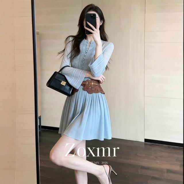 Seven七- 大方 絕美 海邊 度假 蕾絲 刺繡 拼接 镂空 藍色 圓領 長袖 a字連 衣裙 女