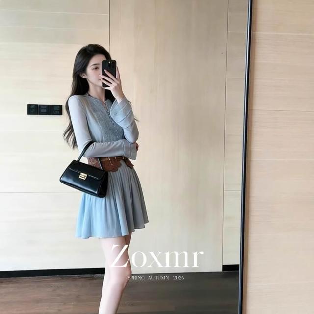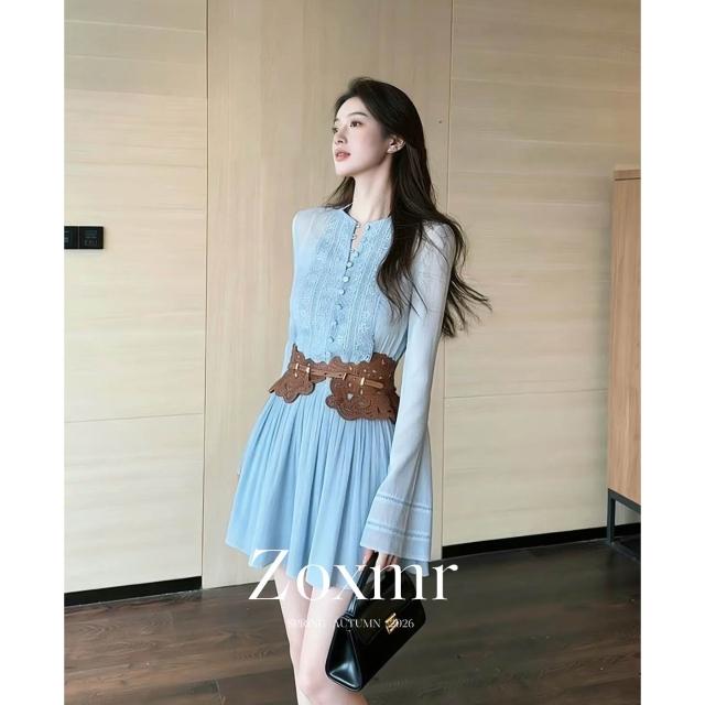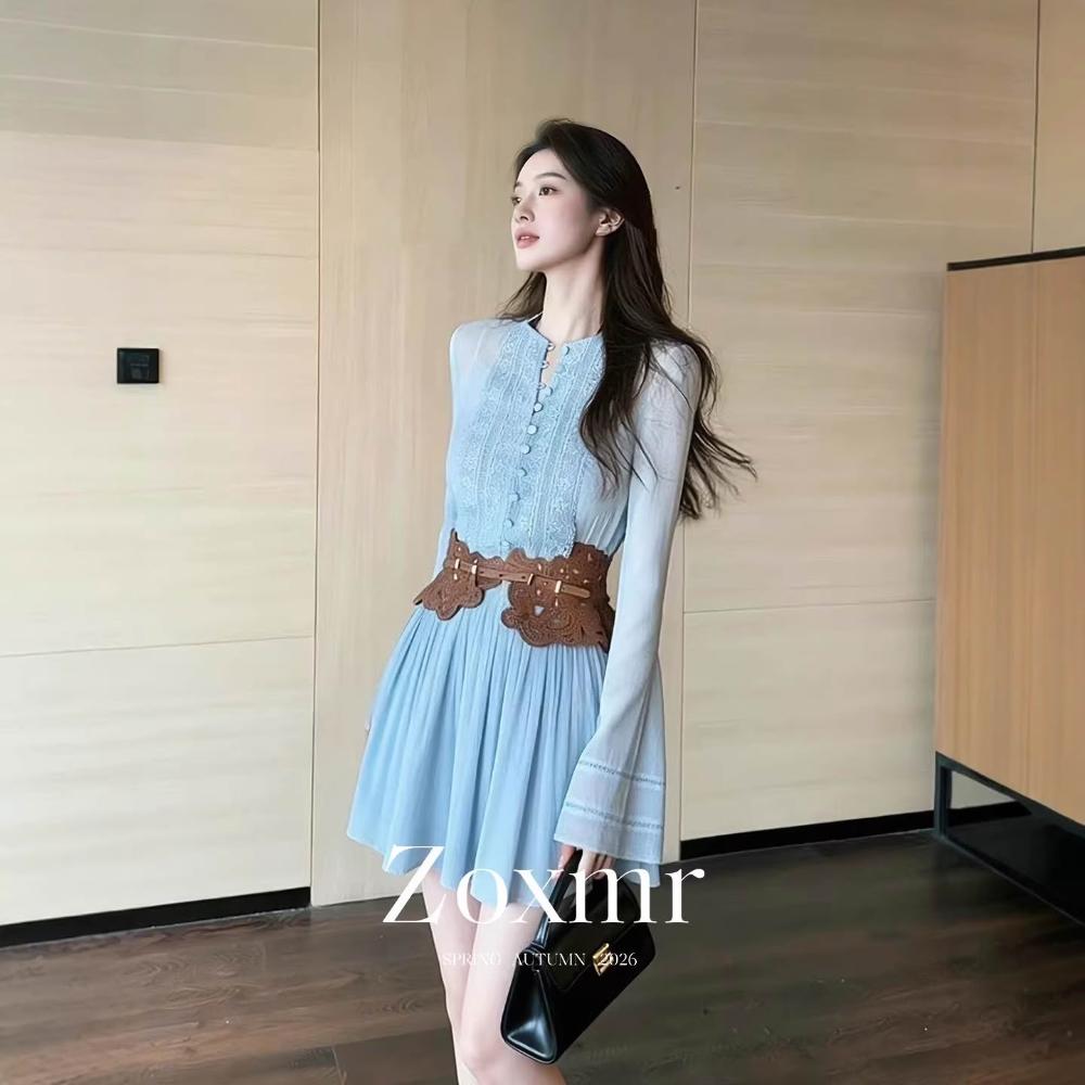 Seven七- 大方 絕美 海邊 度假 蕾絲 刺繡 拼接 镂空 藍色 圓領 長袖 a字連 衣裙 女
