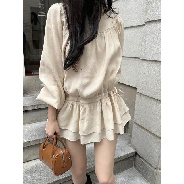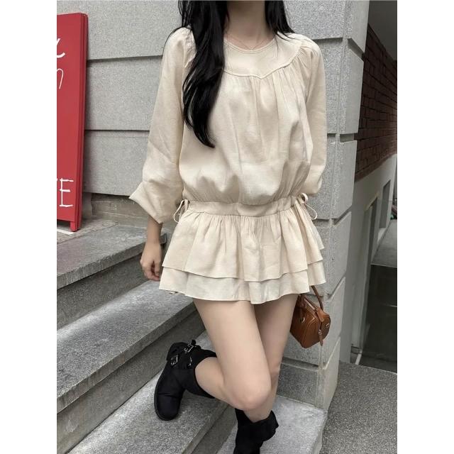 Seven七- 韓系法式甜美溫柔圓領收褶抽繩收腰小個子長袖短裙連衣裙
