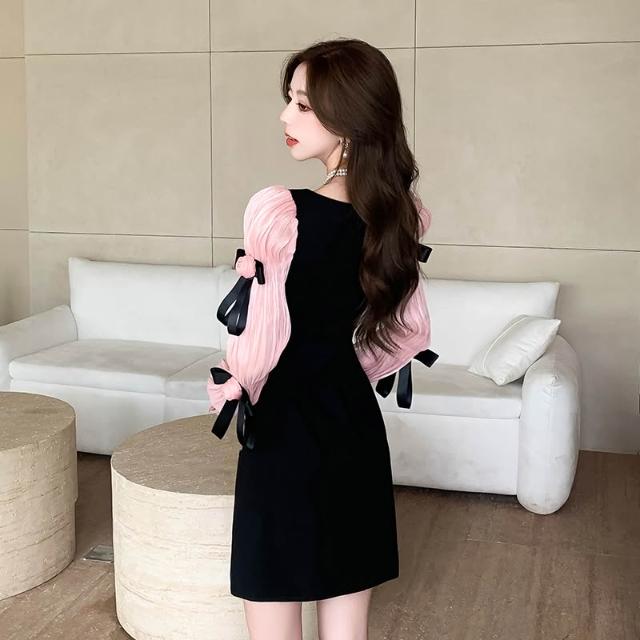 Seven七- 2026甜心公主玫瑰花朵泡泡袖甜美修身長袖連衣裙