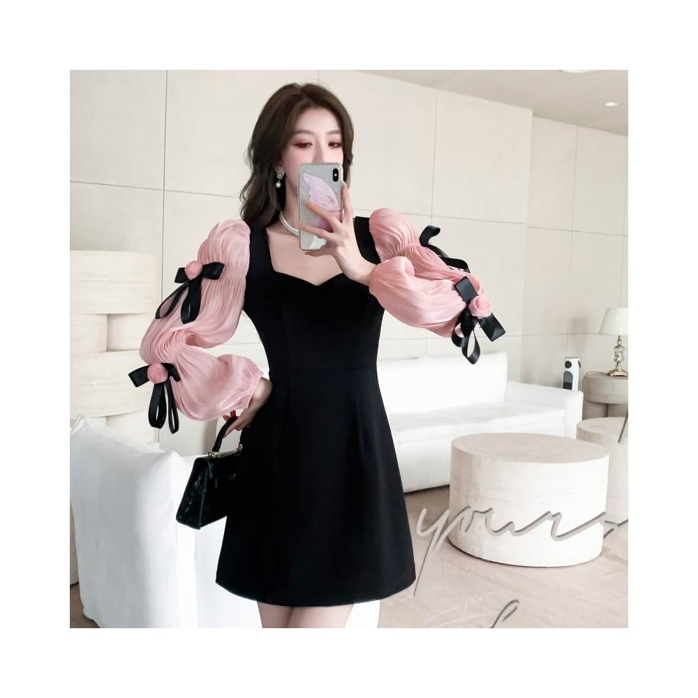 Seven七- 2026甜心公主玫瑰花朵泡泡袖甜美修身長袖連衣裙